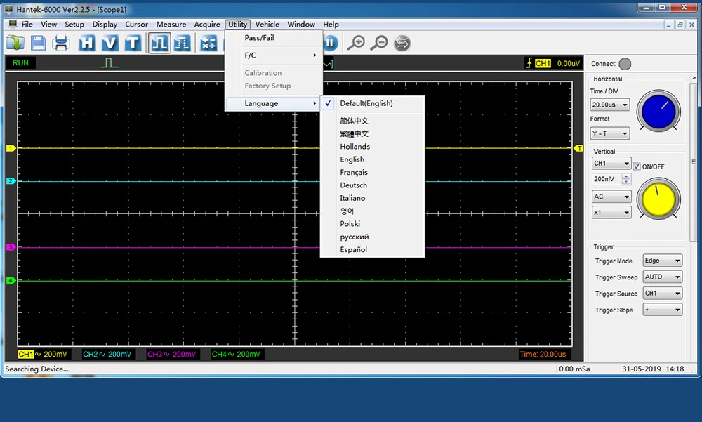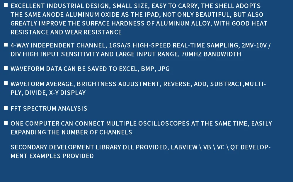 Hantek6074BE серии комплект Стандарт оснащен более 80 типами автомобильной функции измерения (действие зажигания/датчик/Диагностика шины/артистка/запуск и зарядка); Интерфейс USB 2,0 подключи и работай, и не нужно дополнительное питание; поддержка планшетного ПК; Поддержка WIN10/ WIN8/WIN7 и т. Д. Бесплатное обновление программного обеспечения постоянно, более высокая производительность; Поддержка USBXI, прост в эксплуатации. 4 изолированных канала осциллографа, 1GSa/s частота дискретизации в реальном времени, 2 мВ-10 В/DIV Высокая Входная чувствительность и большой входной диапазон, 70 МГц высокая пропускная способность, небольшой размер, легко носить с собой. Динамическое отслеживание курсора, запись сигналов и функция воспроизведения. Характеристика Стандартный оборудованный более 80 типов автомобильной функции измерения; Первая Диагностика: вакуумное зажигание впускного коллектора, регулировочный клапан вакуумного зажигания, зажигание холостого выхлопа, пусковое зажигание выхлопных газов; Зажигание: Первичное и вторичное; датчик: расходомер воздуха, распределительный вал, коленчатый вал, распределитель, лямбда-датчик, положение дроссельной заслонки; Диагностика шины: анализ данных CAN-шины, честность сигнала CAN-Bus, CAN АВТОБУС LH долгое время сбора, LIN автобус; Артистка: бензин/дизель Подходит для портативных компьютеров, настольных ПК и подходит для использования с мобильных устройств и деловых поездок. Поддержка WIN10/ WIN8/WIN7 и т. Д. USB 2,0 интерфейс plug and play, и не нужно дополнительное питание; Отличная функция, более 20 видов функции автоматического измерения, функция проверки пропуска/сбоя. Находчивая функция триггера, динамическое отслеживание курсора, запись сигналов и функция воспроизведения. Хороший Механический дизайн с небольшим размером, который удобен для переноски. Внешний корпус изготовлен из того же материала с анодированным алюминием для iPad. Обладает большой термостойкостью и абразивной стойкостью с красивым внешним видом. Твердость поверхности из алюминиевого сплава значительно улучшается. 4 изолированных канала осциллографа, 1GSa/s частота дискретизации в реальном времени, 2 мВ-10 В/DIV Высокая Входная чувствительность и большой входной диапазон, 70 МГц высокая пропускная способность, Данные формы волны могут выводиться в эксель, BMP,JPG. Усреднение формы волны, послесвечение, контроль легкости, реверс, сложение, вычитание, умножение, деление, X-Y дисплей. Анализатор спектра Один компьютер может соединиться с несколькими осциллографами, легко расширить номер канала. Предоставление вторичной библиотеки разработки DLL; Предоставление Labview \ VB \ VC \ QT Пример Разработки