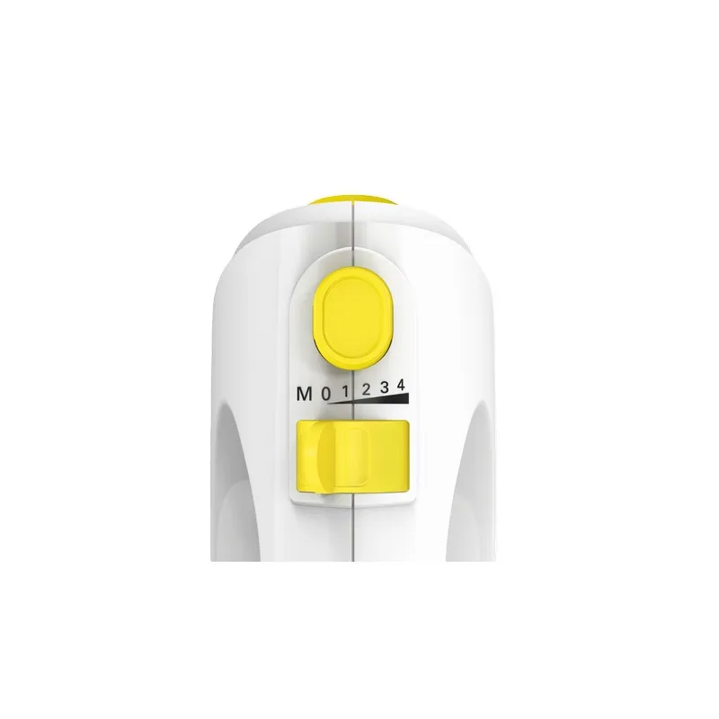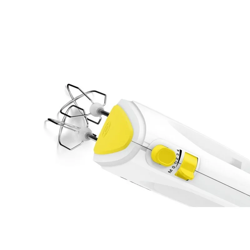 Блестящие результатыМощность: 375 ВтСовременный мотор: мощный и в то же время легкий и не шумный.4 скоростных режимаДополнительно: импульсный (турбо)режим (максимальная скорость)КомфортЭргономичный дизайн для комфортной работы. Удобно держать как в правой, так и в левой руке.Устройства и аксессуары легки в очистке: подходят для посудомоечной машины.Отдельная кнопка для отделения венчиков и крюковОтсек для намотки кабеляБезопасностьВсе пластиковые части, контактирующие с продуктами, безопасны для здоровья и не содержат BPA (Бисфенол А).Разносторонние возможности2 венчика для достижения первоклассных результатов при взбивании и перемешивании2 крюка для замешивания теста