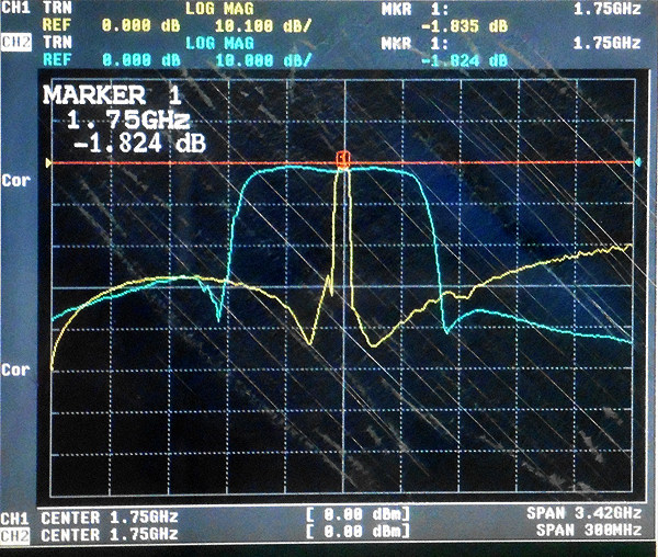 Фильтр имеет пропускную способность 1 дБ 75 МГц и крутую характеристику отключения. Тестирование сигналов UMTS/AWS для частотного диапазона 1710 - 1785 МГц эффективно фильтрует внешние сигналы, уменьшает шум и увеличивает динамический диапазон. Модель: FBP-1750s Сопротивление: 50 Ом Центральная частота: 1747,5 МГц Полоса пропускания (полоса пропускания 1 дБ): 1710 ~ 1785 МГц В диапазоне пропуск частиц по уровню поверхности: <2,5 дБ (станд.: ~ 1,9 дБ) Максимальная мощность нагрузки: 100 мВт (20 дБм) Интерфейс: SMA-M, SMA-F Диаграмма частотного отклика: