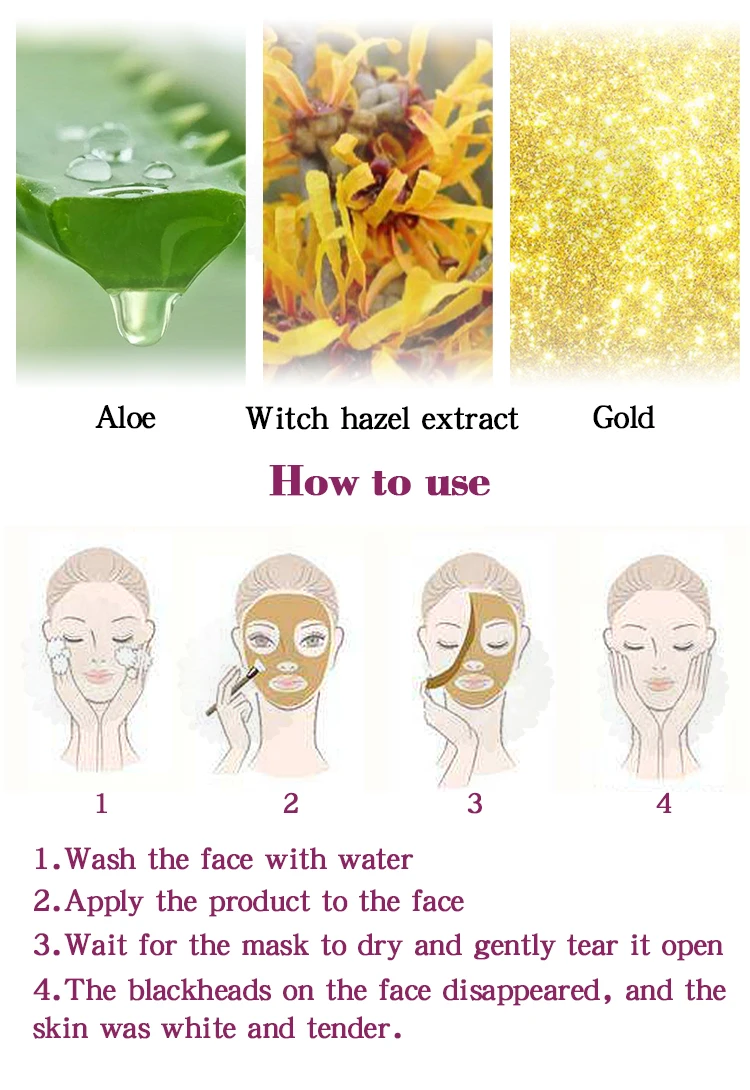 Содержит золотые ингредиенты, сотрудничая с различными питательными и косметическими ингредиентами, паста мягкая и деликатная, которая помогает очистить черную голову и грязь в пор, очистить отходы кутина и косметические остатки, И улучшает шероховатую, чистую мышцу, управляющее масло и тонкую кожу, Чтобы сделать кожу нежной и прозрачной.
