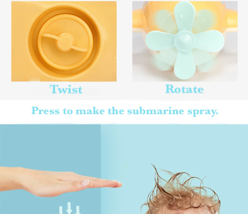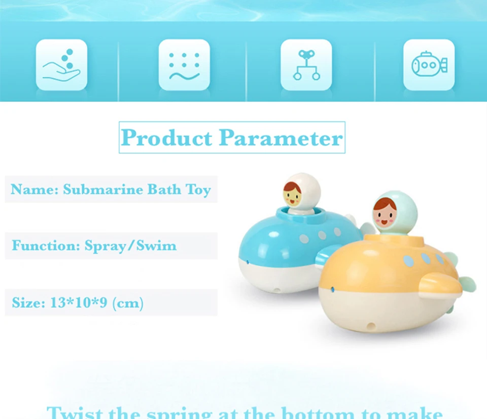 1. Поверните пружину в нижней части, чтобы сделать подводную лодку вращаться в воде; 2. Нажмите на фигуру, чтобы сделать подводный спрей.