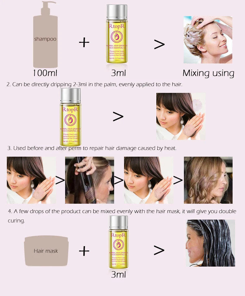 1. Добавьте соответствующее количество этого продукта в шампунь (100 мл шампунь плюс 3 мл). Смешанный шампунь. Как обычно, можно использовать шампунь. 2. Можно непосредственно капать 2-3 мл в ладони, равномерно наносить на волосы. 3. Используется до и после химической завивки для восстановления повреждения волос, вызванного нагревом. 4. Несколько капель продукта могут быть равномерно смешаны с маской для волос, это даст вам двойное лечение.