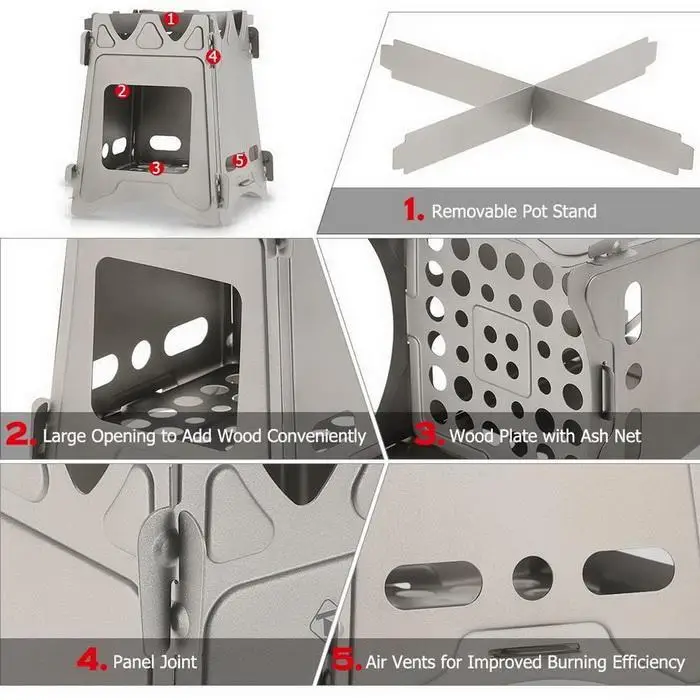 Material: Titanium Metal Color: Silver Item: Titanium Stove Size: 160x125x98mm Stove Wall Thickness: 0.6mm Stove Door Size: 73x66mm(WxH) Structure: Split Structure Applicable: 1-2 People Fuel Type: Firewood, Branches and Leaves Occasion: Outdoor Quantity: 1 Pcs Feature: This stove is built with titanium construction that is corrosion-resistant, extremely durable and light. Connect all panels together by each side which will just take seconds to complete. Wide opening design for convenient adding wood and improved air flow, higher burning efficiency. Crossed-stand trivet creates a stable cooking platform for any pot size. Fits into your pocket and backpack, very easy to carry. Package Content: 1 x Titanium Stove Note: Due to the difference between different monitors, the picture may not reflect the actual color of the item.