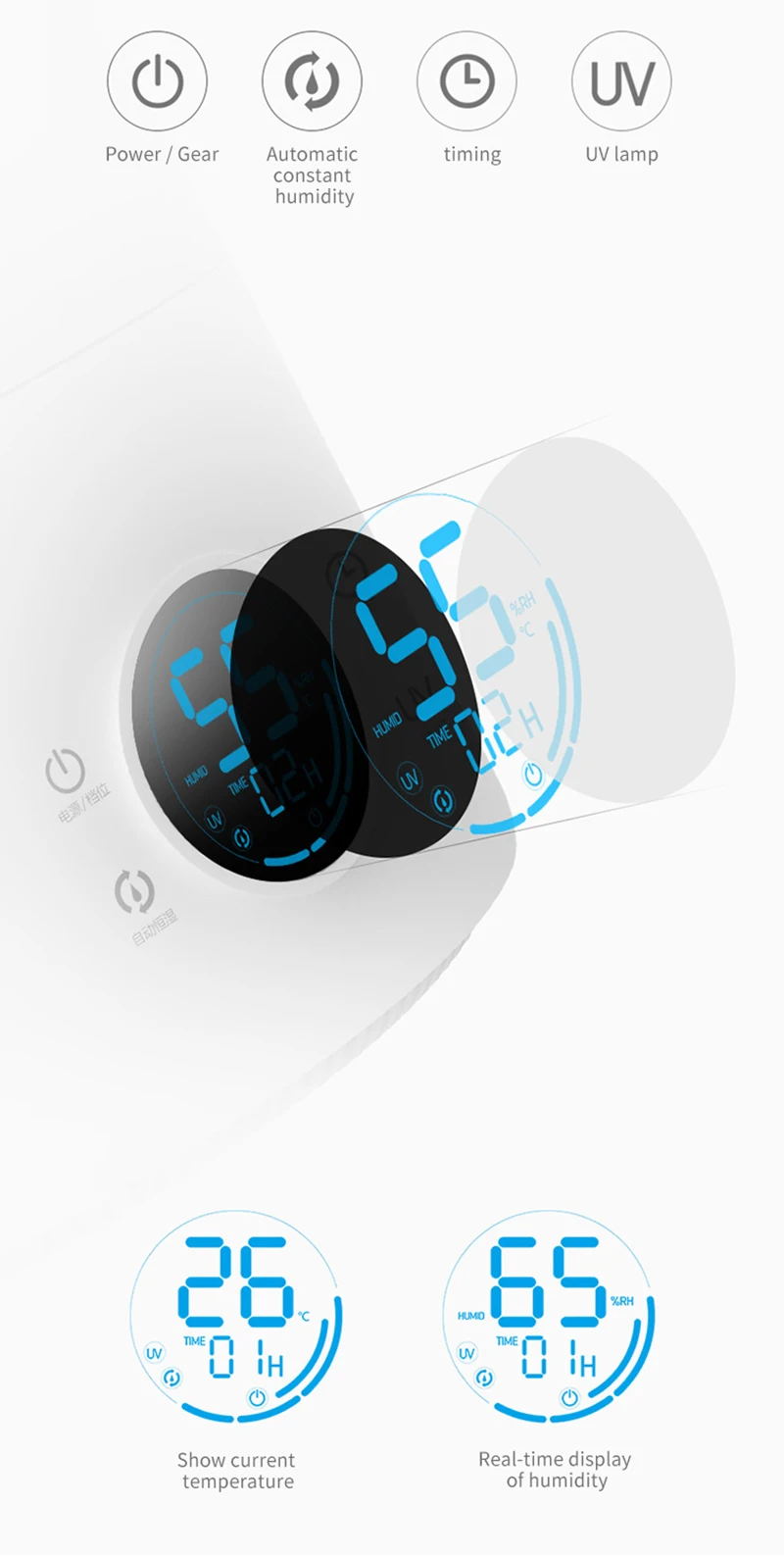 Прозрачная температура экрана/Влажность показывает, что вы хотите знатьДля того, чтобы сообщить нам статус температуры/влажности в любое время,Большой цифровой экран увлажнителя оцифровывает наши Нечеткие чувстваО окружающей среде, четко отображает температуру и влажность тока,И текущий режим, позволяя нам увлажнять в адресной манере.