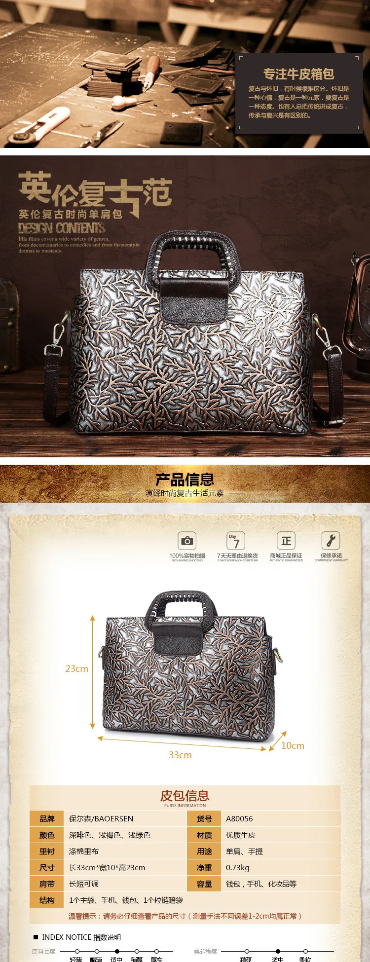 Цвет:Кофе, серебряный кофе, зеленыйМатериалы: натуральная кожа (Высококачественная воловья кожа)Общий размер: (Д х Ш х В): 33x10 x каблук 10 см (12,3x3,94x9,06 дюйма)Плечевой ремень:РегулируемыйНапоминание:Возможны отклонения на 1 - 3 см вследствие измерений вручную.Напоминание:Из-за настроек монитора и условий освещения цвет изделия может отличаться от изображения;