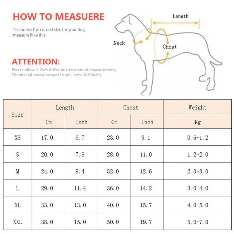 1. Пожалуйста, проверьте вашего питомца замеры изделий сделаны вручную, поэтому убедитесь в том, что одежда подходит для домашних животных перед тем, как вы заказываете (1 дюйм = 2,54 см)