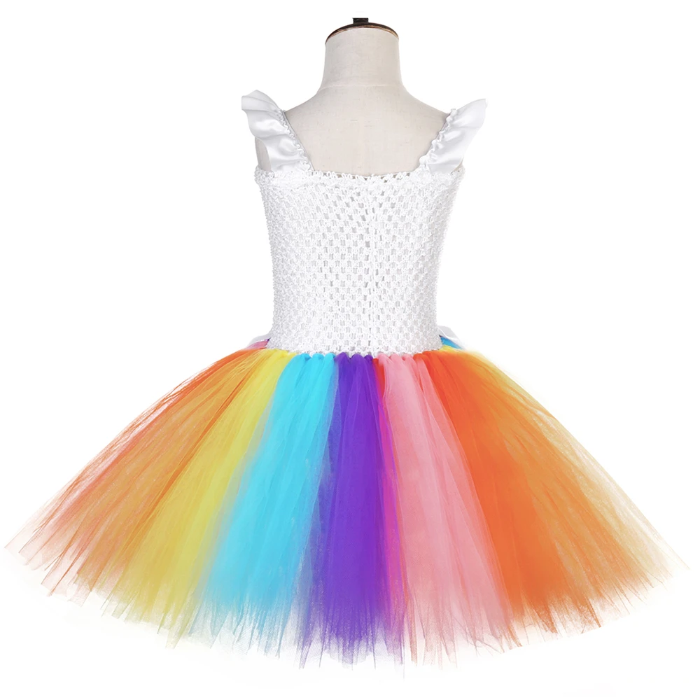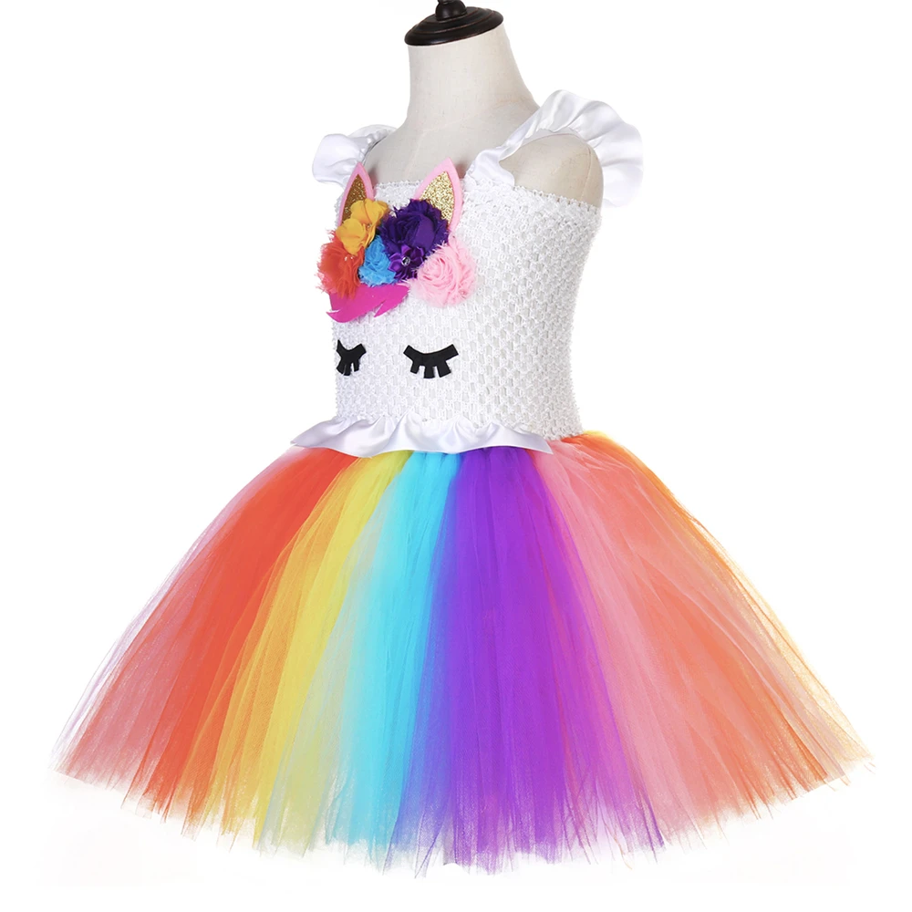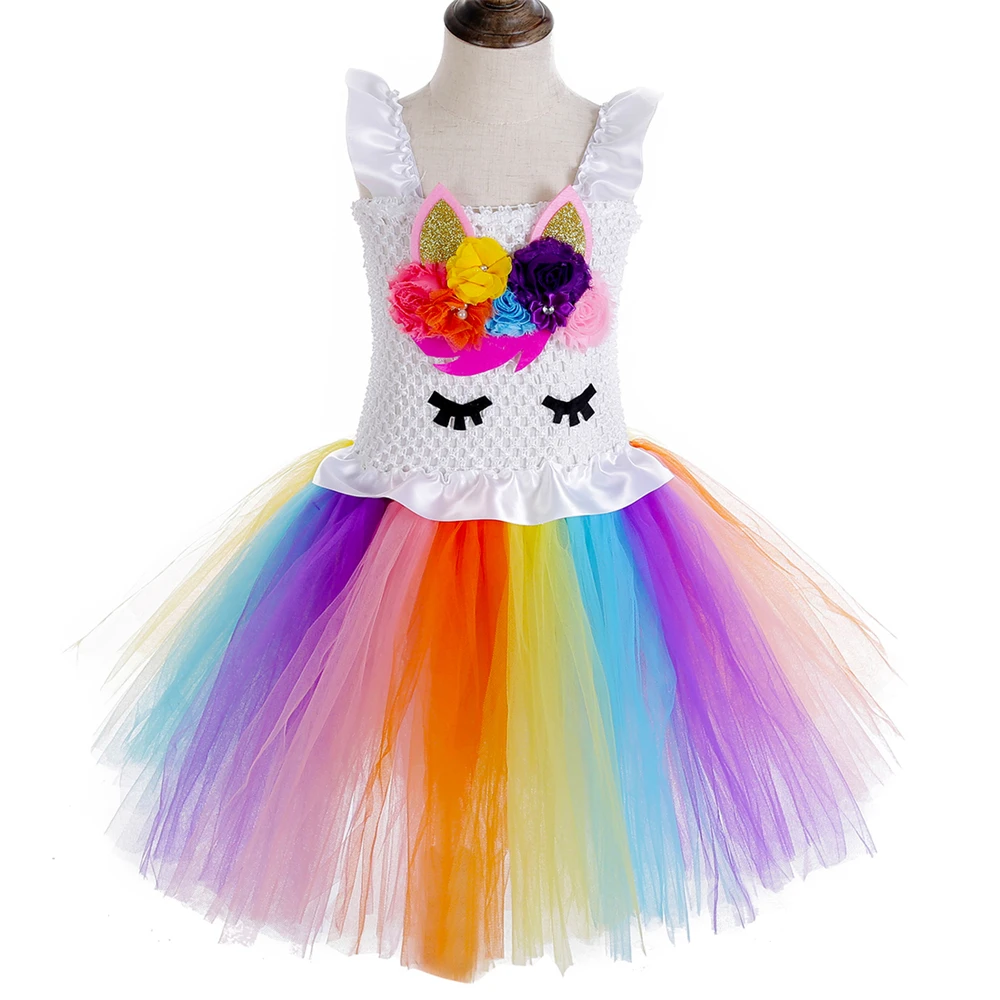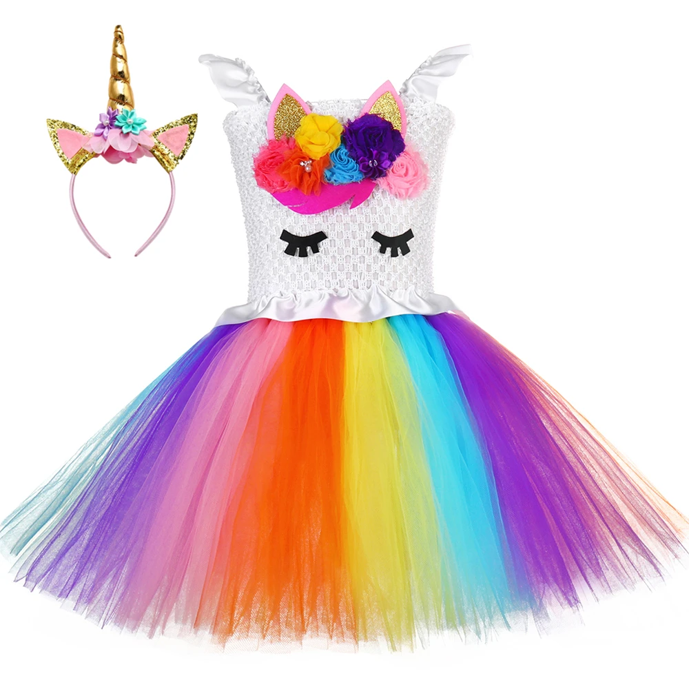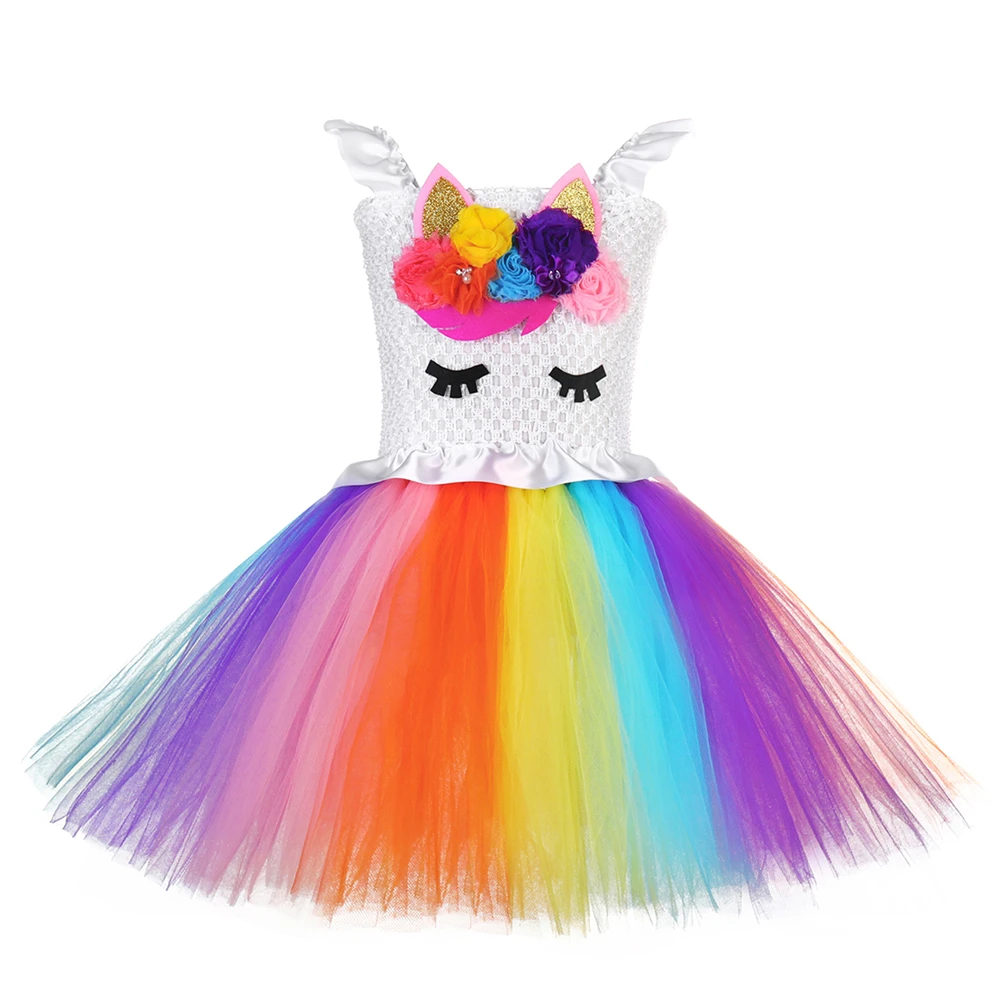 Платье-пачка с радужными цветами и единорогом для девочек; Вечерние платья принцессы из тюля для девочек на день рождения; Костюм единорога для девочек на Хэллоуин; Одежда