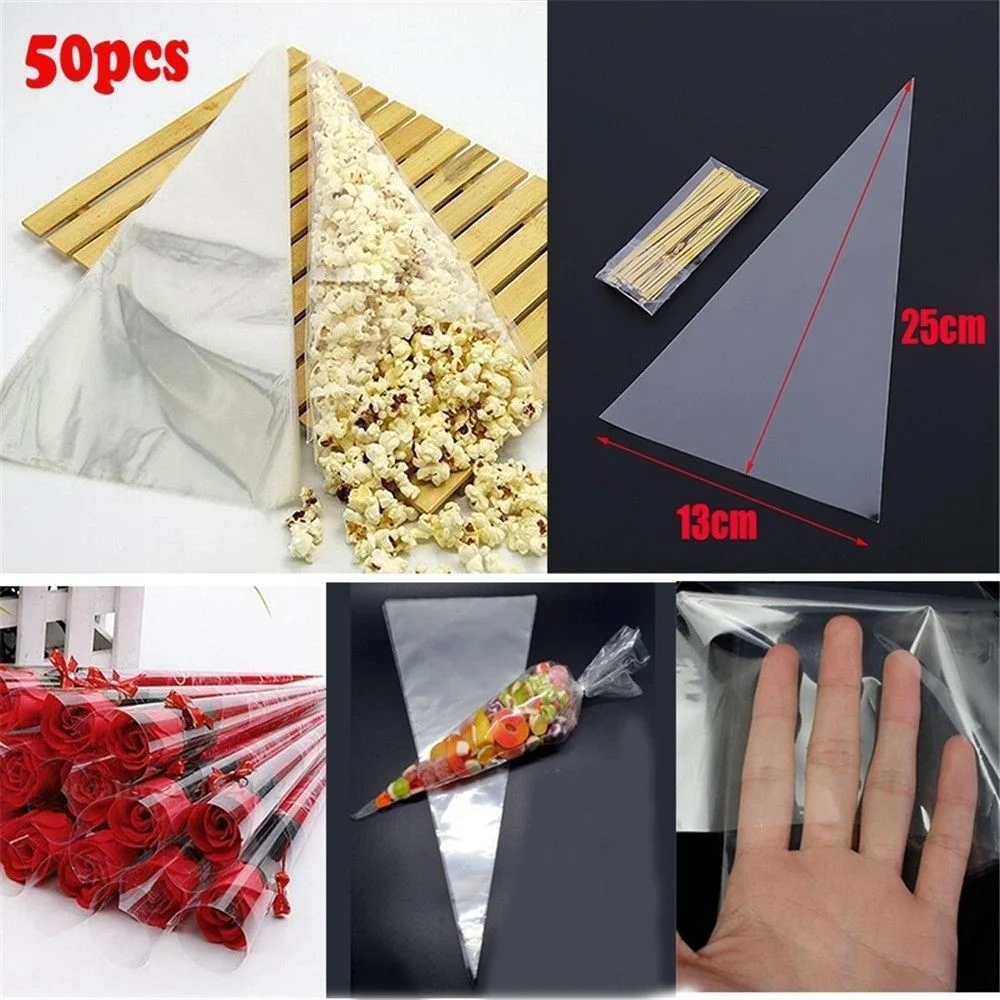 50 шт., рождественские подарки, цветок, шоколад, Свадебная вечеринка, попкорн, Хэллоуин, конфеты, прозрачная целлофановая упаковочная сумка с твист галстуками, Сладкая коробка, конус (Размер: 13 см * 25 см)