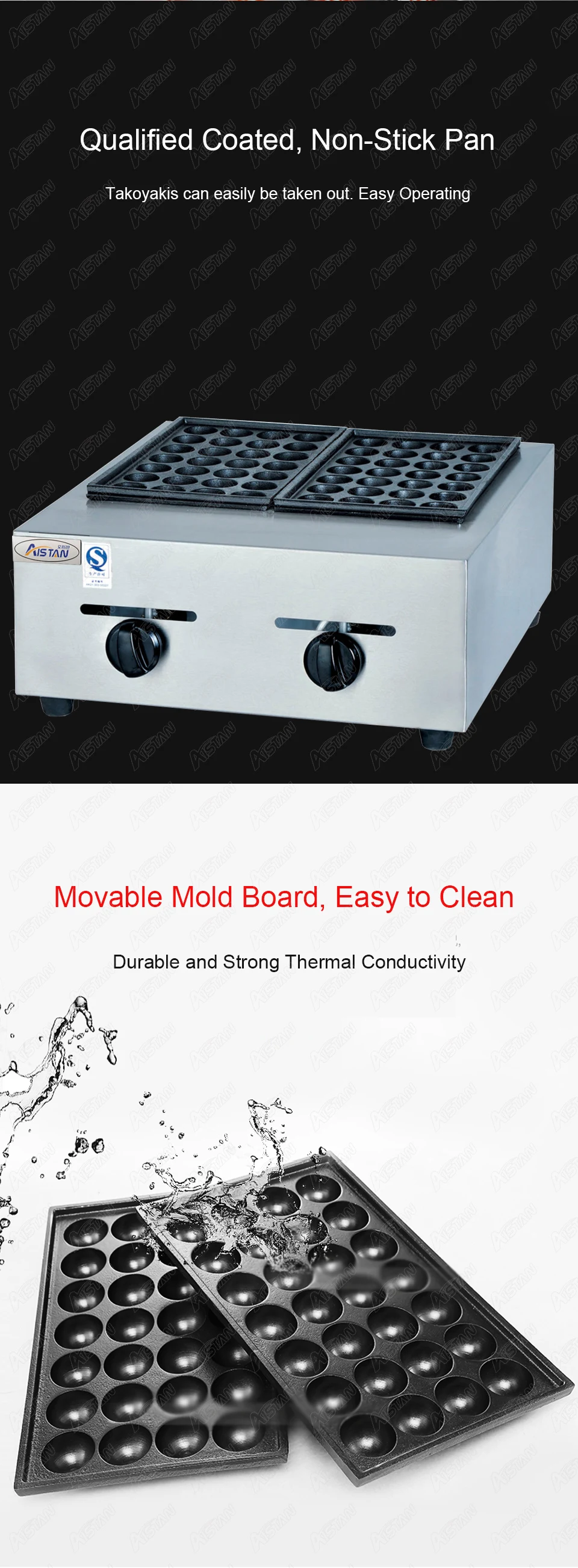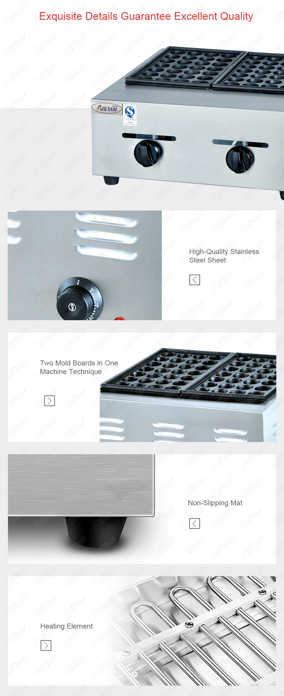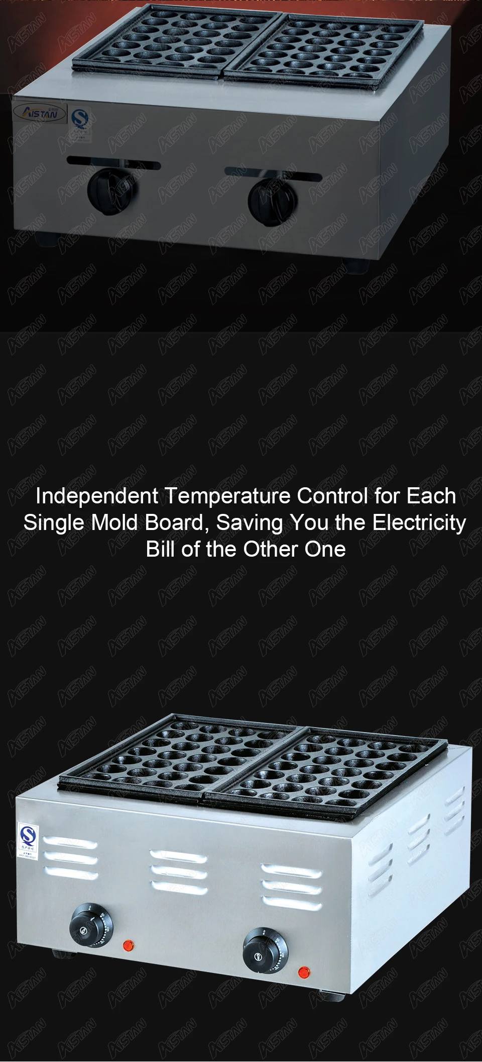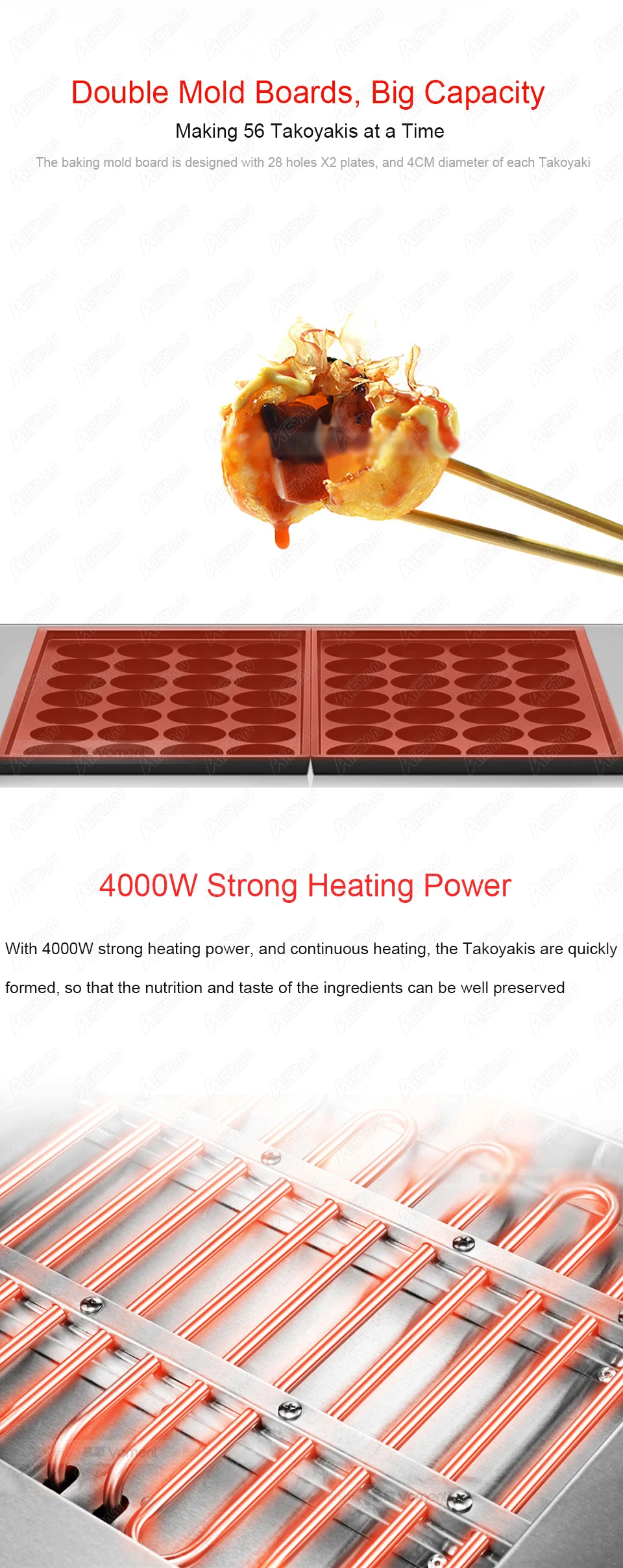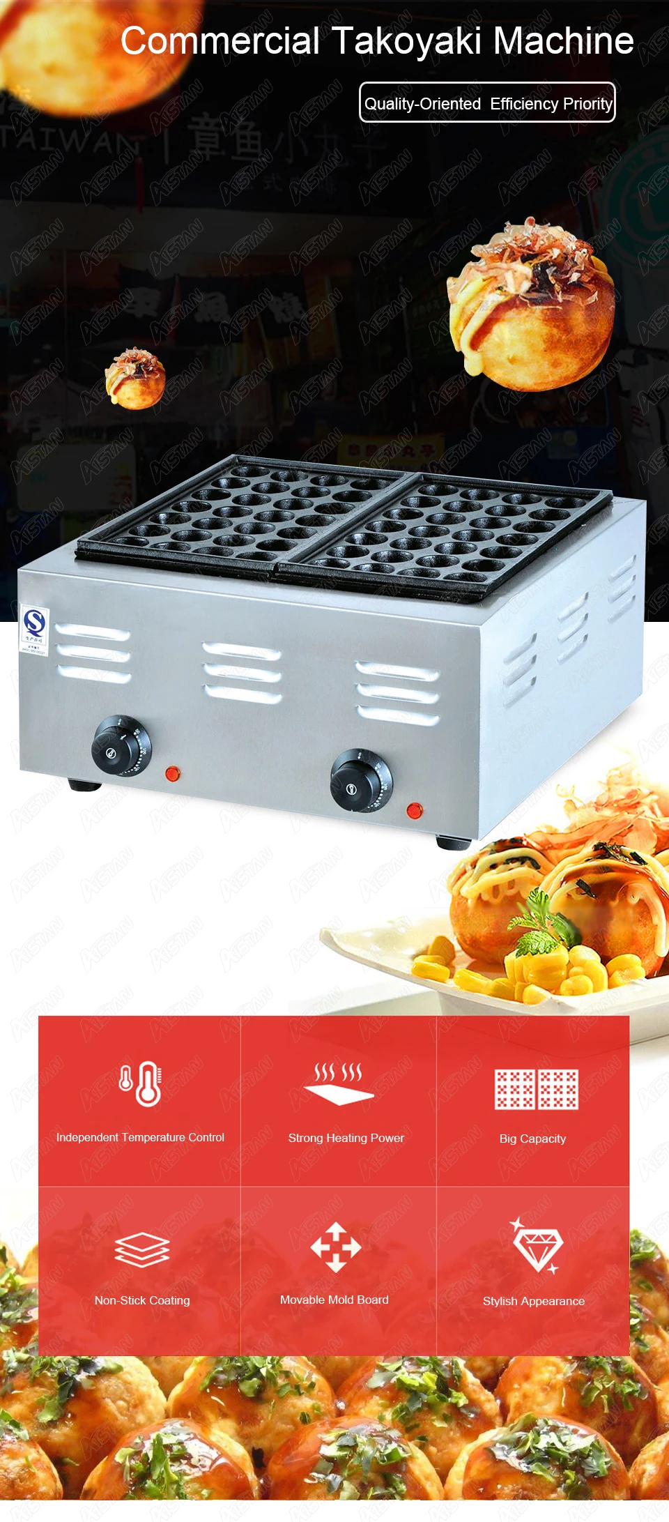 1. Независимый контроль температуры для каждой формовочной платы: экономия счета за электричество другого 2. Большая емкость: изготовление 56 такоякис одновременно. Доска для выпечки предназначена с 28 отверстиями X2 пластин и диаметром 4 см каждого такояки 3. Сильная Мощность нагрева: с высокой мощностью нагрева 4000 Вт и непрерывным нагревом, быстро формируются такоякис, так что питание и вкус ингредиентов могут быть хорошо сохранены 4. Антипригарное покрытие: квалифицированное покрытие, антипригарная сковорода. Такоякис можно легко вынуть. Простота в эксплуатации 5. Подвижная доска формы: легко моется