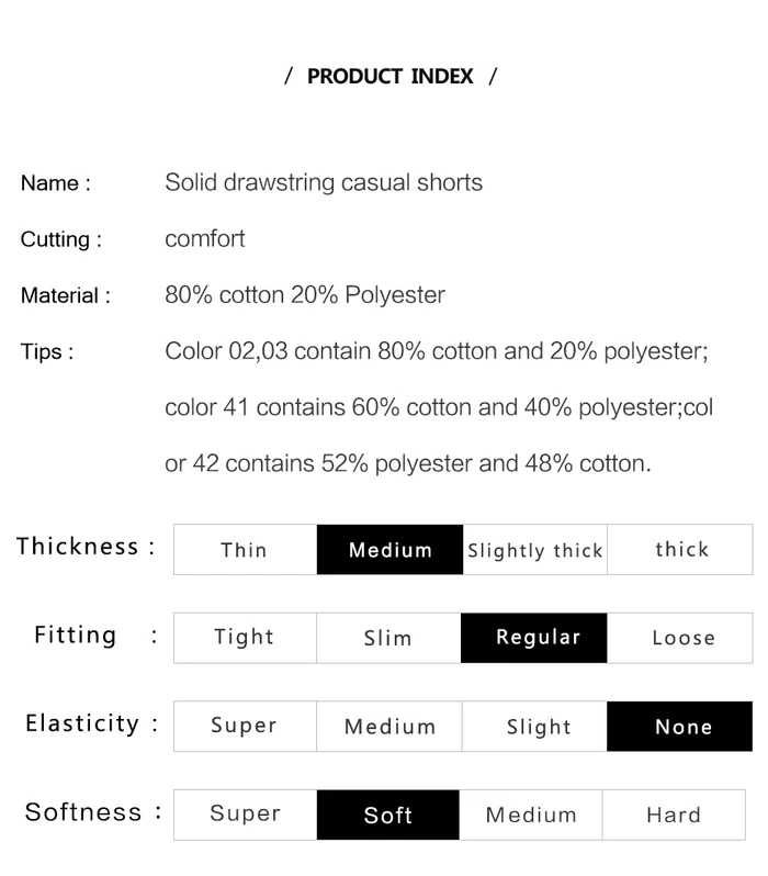 смесь ткани из хлопка и полиэфира, чувствительная текстура,мягкая и удобная на ощупь,эффект анти-морщинки износоустойчивая; drawstring шкафут, удобные и легкие при ношении,карманы очень удобные. Советы: из-за разницы тканей, есть разница в составе ;где 02,03 цвета ткани на 80% из хлопка,на из 20% полиэстера; 41 цвет ткани 60% из хлопка,и 40% из полиэстера; 42 цвет ткани на 52% из полиэстер,и 48%из хлопка; разница не повлияет на качество и комфорт.