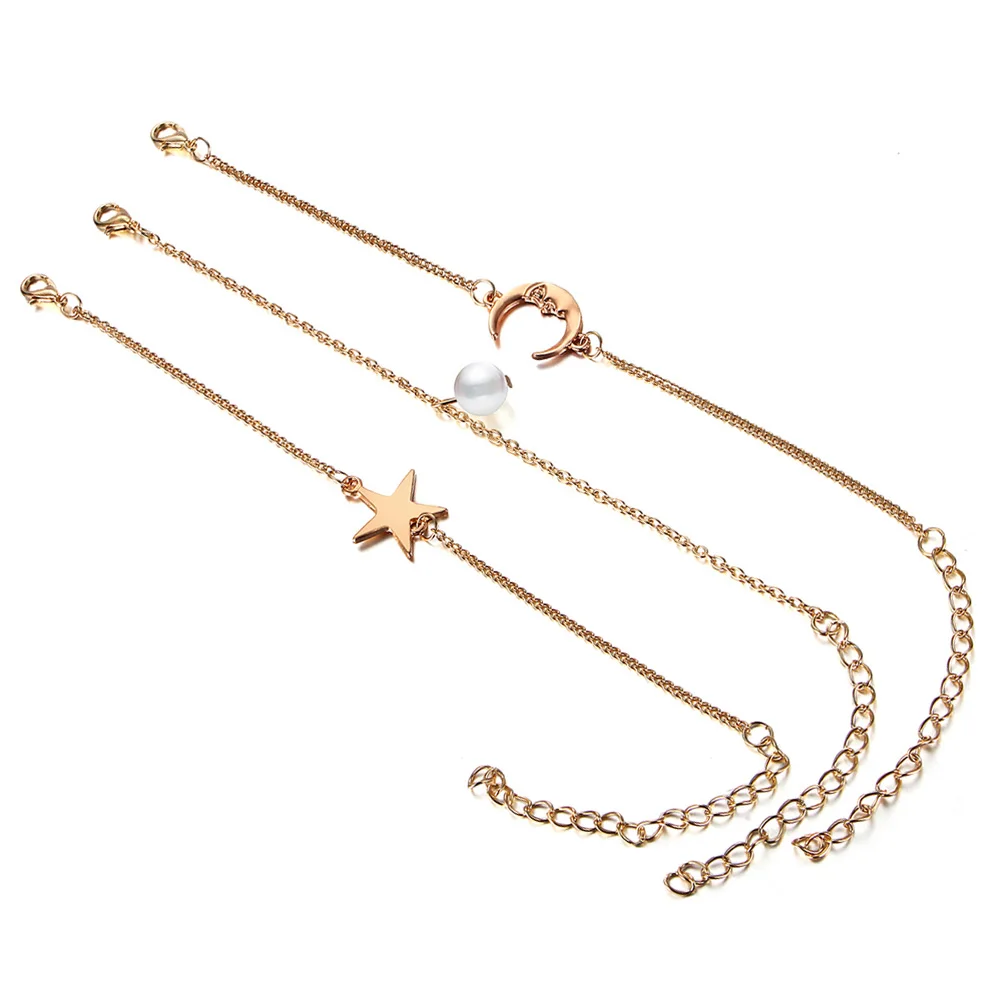 3 шт. Для женщин Браслеты набор ножных браслетов простой стильной застёжкой в виде цепочки из жемчуга в форме звезды, Луны Bracklet & ножные браслеты ювелирные изделия аксессуары