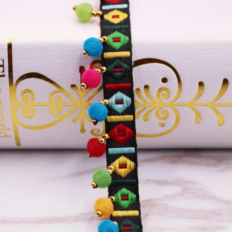 Pulaqi 1 ярд богемная кружевная лента с помпоном и шариковой отделкой из радужной ткани с бахромой для самостоятельного пошива одежды, обувь, сумка, аксессуары для рукоделия