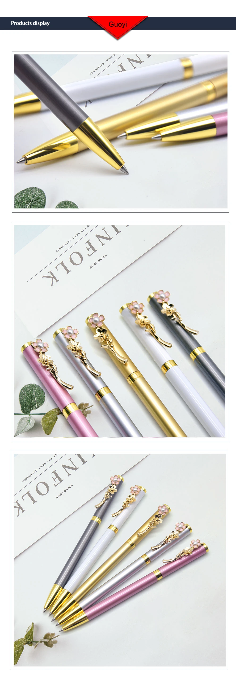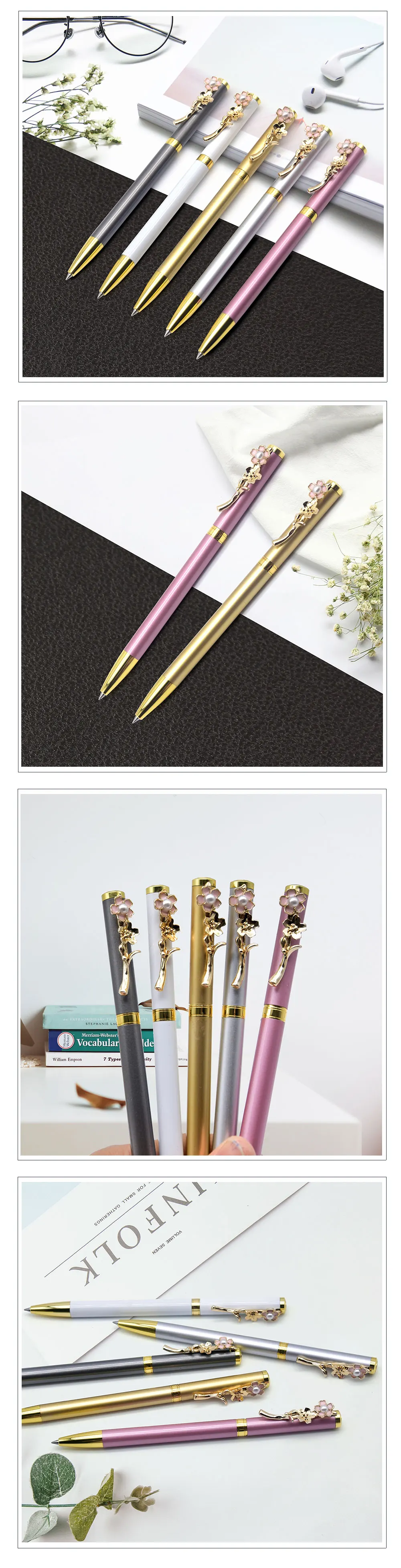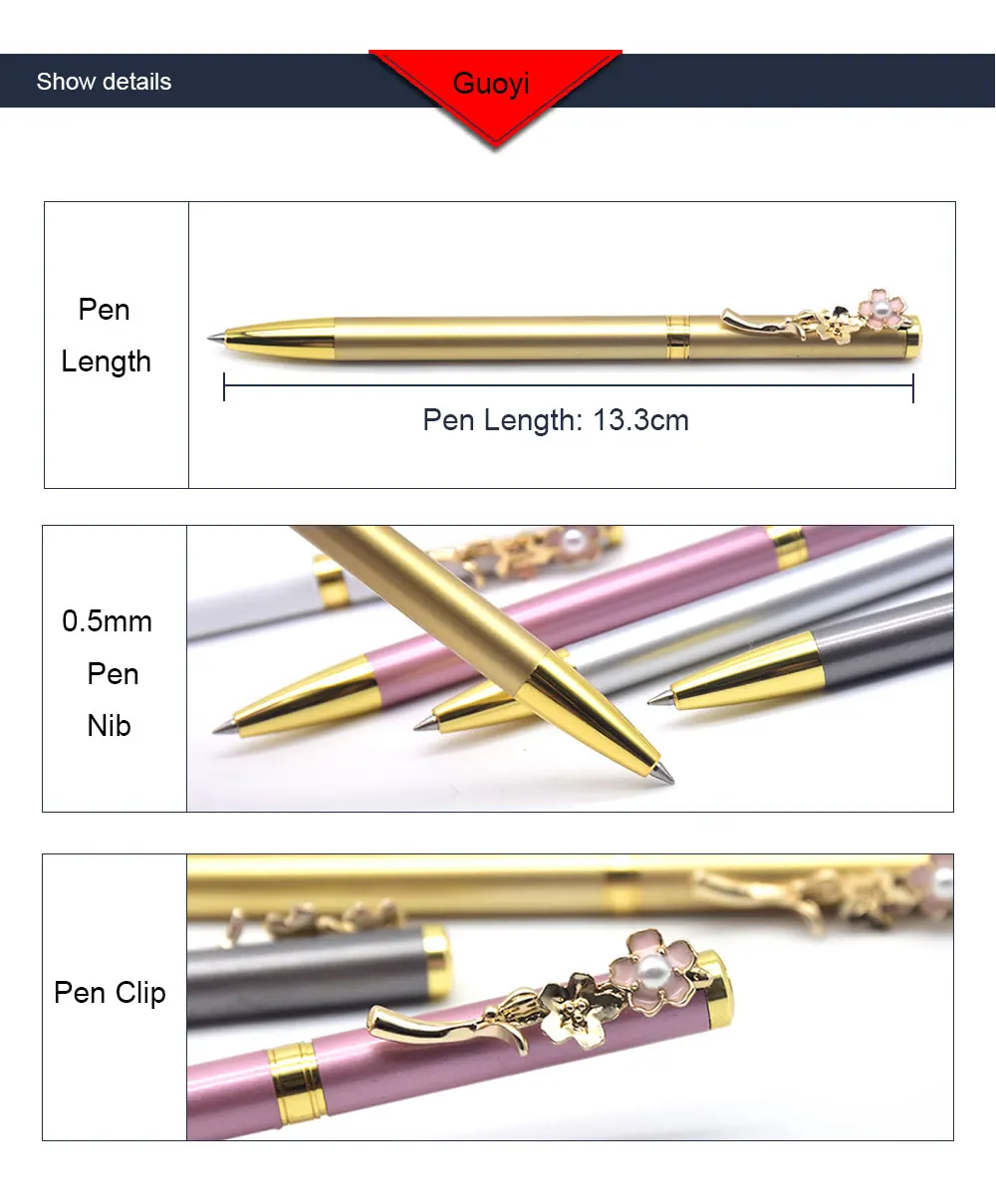 1. Внешний вид: металлический корпус, зажимы для ручки украшены нежными цветами, что в большей степени соответствует женской эстетике. Уникальный дизайн с пятью цветами на выбор. 2. Ощущение: не беспокойтесь о том, чтобы написать, вы почувствуете усталость. Вся ручка весит 24 г. Он не будет чувствовать усталость в течение длительного времени. 3. Эффект: ручка оснащена 0,5 мм заправкой на водной основе, а заправка на водной основе более гладкая и гладкая. Цвета Письма доступны в синем и черном цветах.