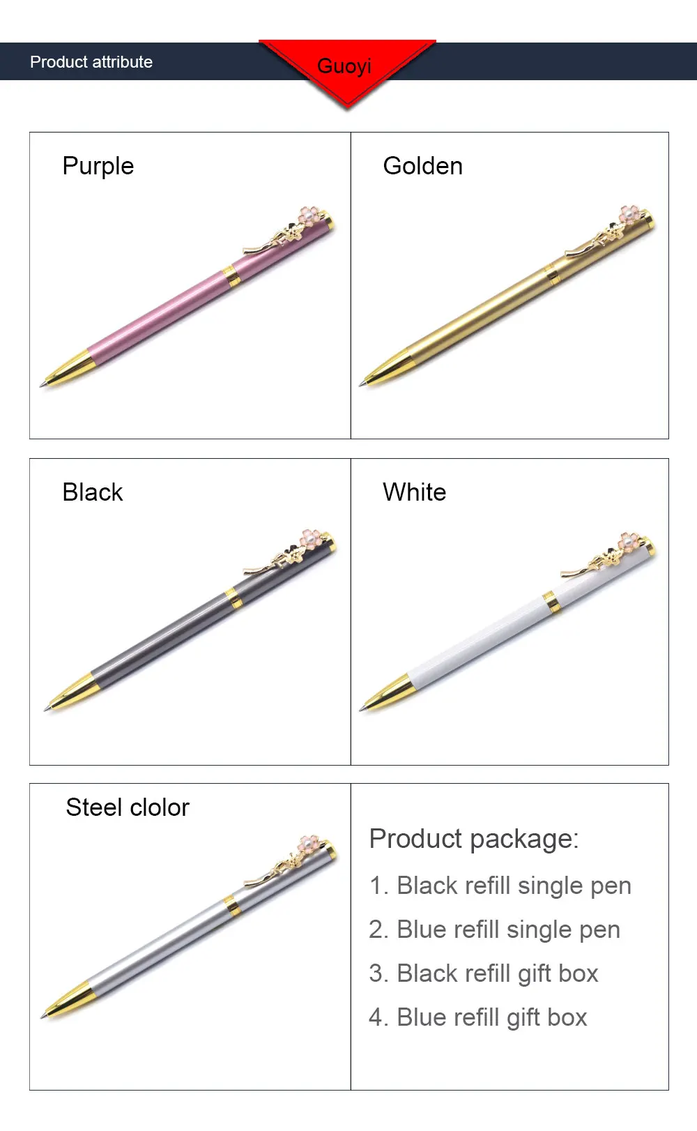 Бренды: Guoyi Номер товара: A137 Материал изделия: металл Длина изделия: 13,3 см Вес одной ручки: 24 г Вес подарочного набора: 75 г Цвет изделия: сталь/черный/фиолетовый/Wihte/золотистый 0,5 мм пера Цвет письма: синий и черный