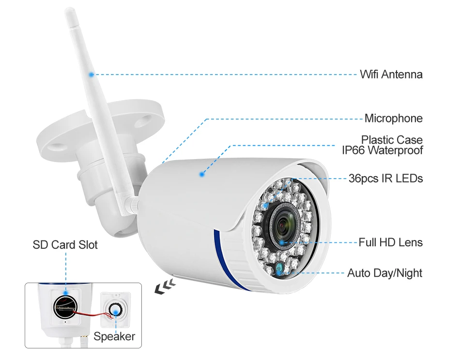Камера добавить 64 ГБ = 1080P + блок питания 12V1A + 64 ГБ sd-картаПосылка в комплекте1 шт. 1080P Беспроводная ip-камера водонепроницаемая (ABS пластиковый корпус)1 шт. руководство пользователя на английском языке