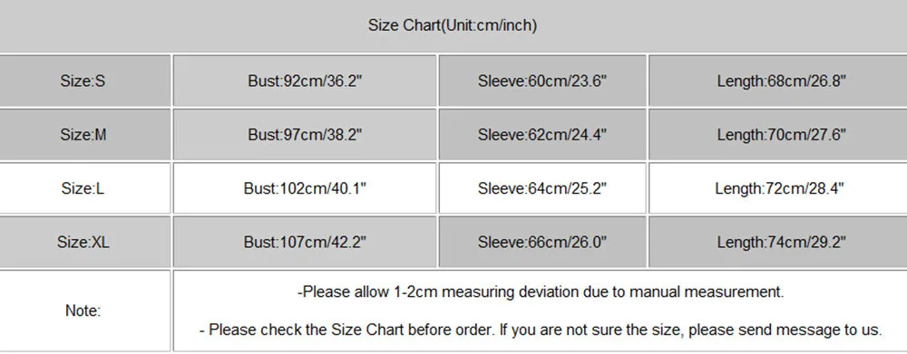 -Пожалуйста, проверьте таблицу размеров перед заказом. Если вы не уверены в размере, пожалуйста, отправьте нам сообщение.