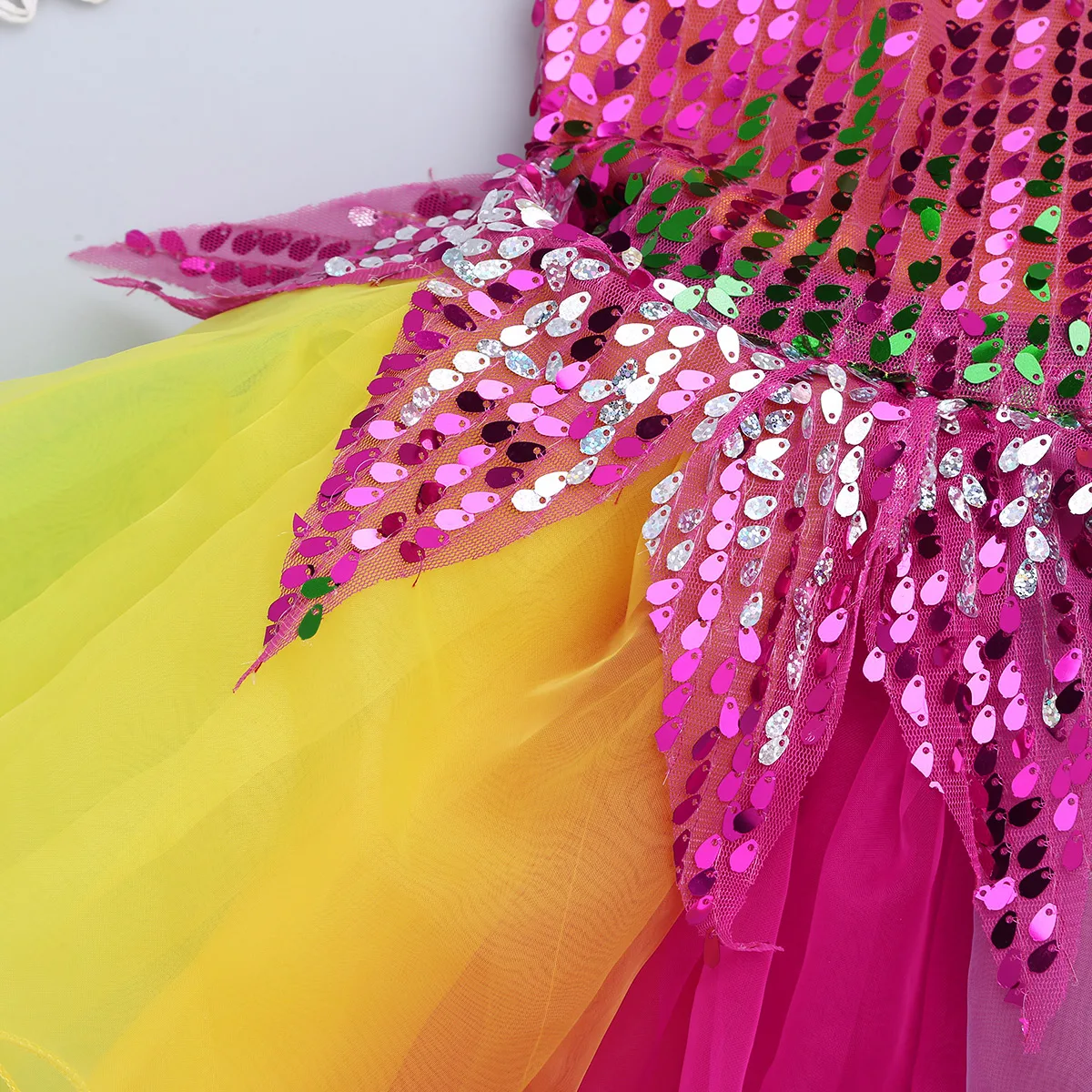 Платье с блестками и сетчатым верхом в форме листьев. 2 слоя платье, топ разноцветный тюль слой, 1 слой атласной подкладки. Подходящий браслет с несъемным цветком.