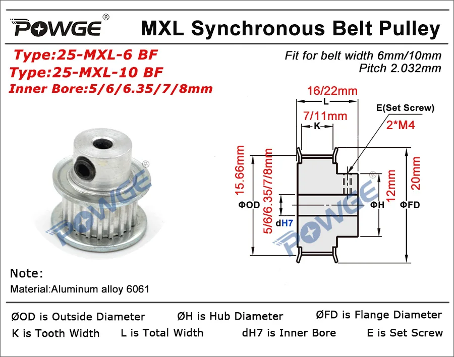 Дюймовый трапециевидный алюминиевый сплав25 зубьевMXL шкив TimimgДиаметр 5/6/6.35/7/8/10/12 мм25-MXL-6 BF и 25-MXL-10 BF шаг 2,032 мм дляШирина 6 мм/10 ммСинхронный ремень MXL подходит для обычных фонарей, подходит для передачи крутящего момента и светильник, Доставка 25T 25 зубцов