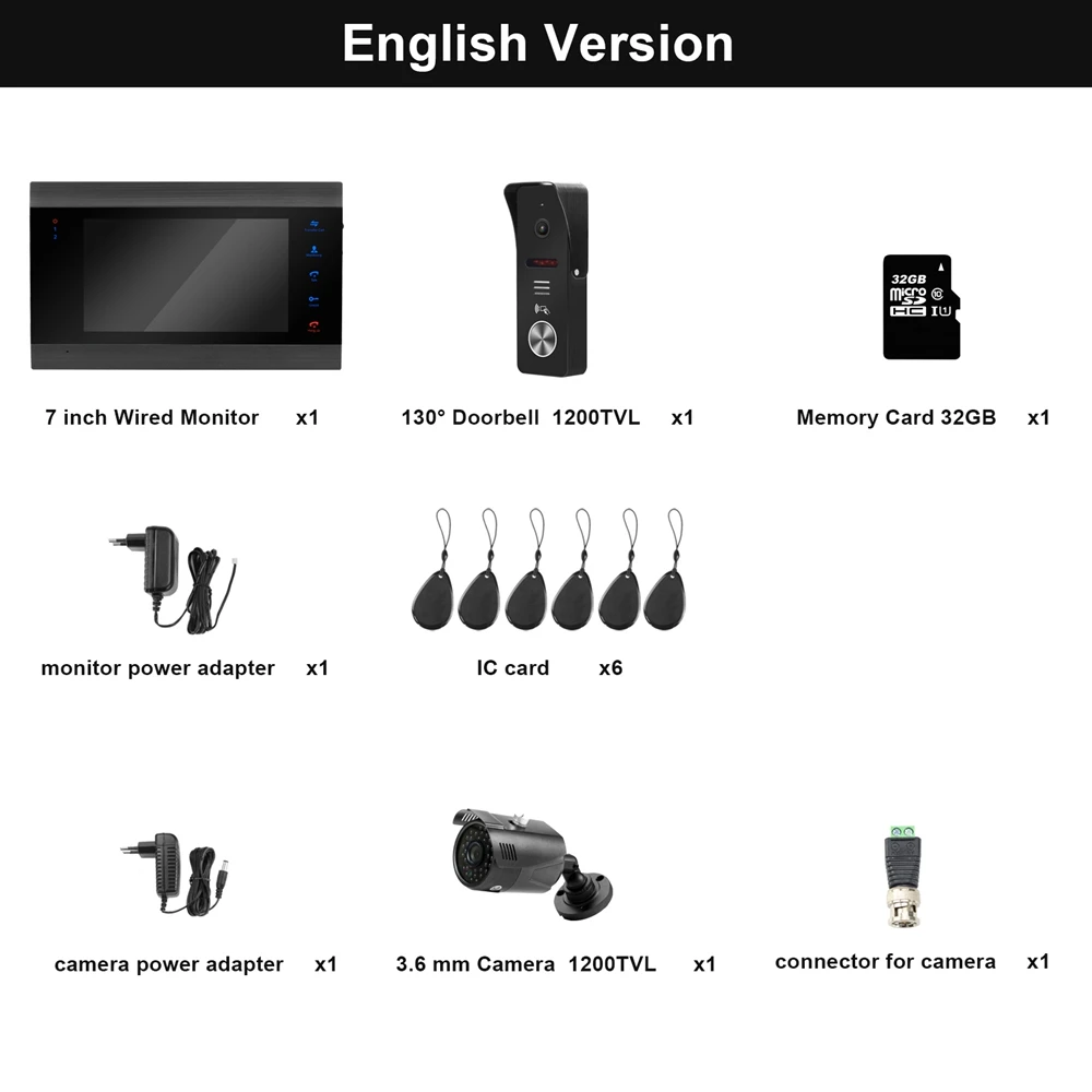 Поддержка 1. Запись видео с датчиком движения 2. подключена аналоговая камера 3. дверной звонок камеры/CCTV камеры предварительного просмотра 4. запись изображений/видео 5. ИК Ночное Видение 6. Электронный замок для разблокировки 7. 6 языков: английский/русский/испанский/французский 8. 2 способа разговора 9. Внешняя карта памяти (до 32 ГБ) 10. Регулировка кольца/громкости 11. До 4 видеоинтеркомов, подключенных вместе 12. Интеркомы автоматически выключат экран после остановки работы в течение 1 минуты, чтобы сэкономить электричество!