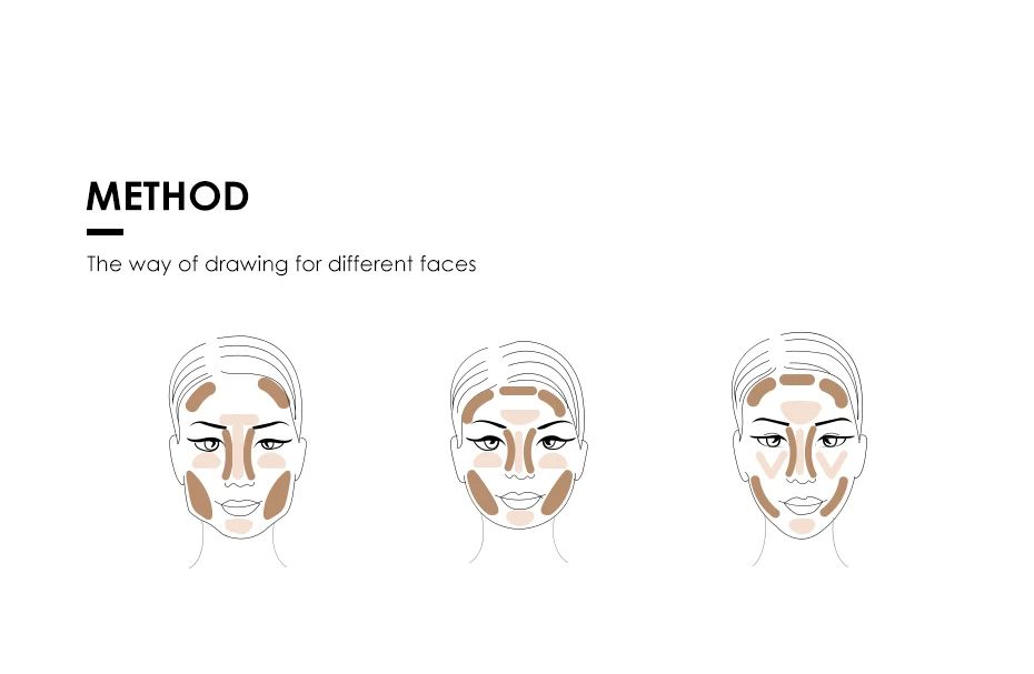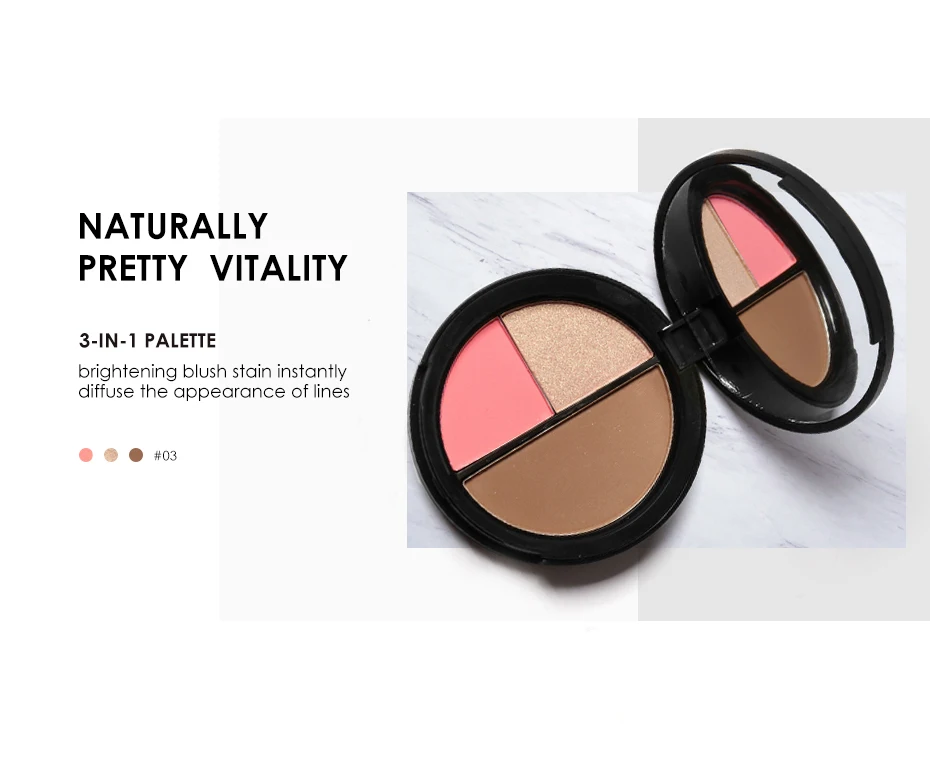 3 цвета в палитре, один мерцающий цвет для подсветки, один матовый бронзирующий порошок для бронзовых щек.