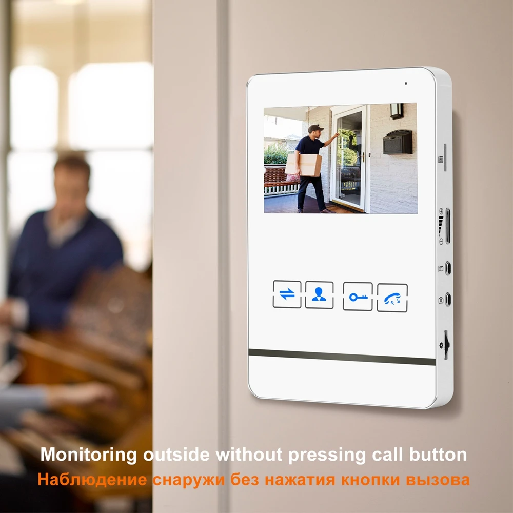 Монитор: 4,3 "широкий цветной HD TFT светодиодный дисплей Режим внутренней связи: двусторонняя связь без использования рук Задержка вызова: 120s Клавиатура: сенсорная кнопка с синим и красным светильник Входная мощность: внешняя мощность DC12V Потребляемая мощность: режим ожидания/1 Вт; Рабочий/5 Вт Материал: акриловый чехол для фортепиано Рабочая температура: -10 градусов + 60 градусов Установка: поверхностное крепление