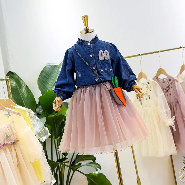 2019 Весенняя Джинсовая блузка + юбка в сеточку, комплект одежды из 2 предметов для девочек, модная детская одежда с рисунком кота, костюм для детей 2-6 лет, одежда для маленьких девочек