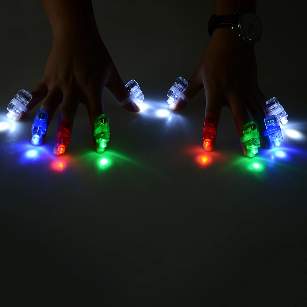 -Эти лазерные лучи имеют яркие светодиодные лампы, установленные в небольших случаях, которые сидят на пальцах с эластичным ремешком.