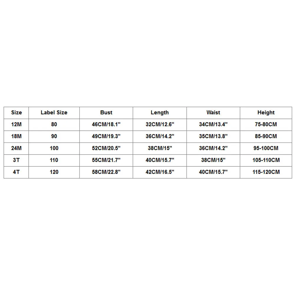 Размер Размер этикетки Бюст Длина Талия Высота 12 м 80 46 см/18,1" 32 см/12,6 дюйма 34 см/13,4 дюйма 75-80 см 18M 90 49 см/19,3" 36 см/14,2" 35 см/13,8" 85-90 см 24 м 100 52 см/20,5 дюйма 38 см/15" 36 см/14,2" 95-100 см 3T 110 55 см/21,7" 40 см/15,7" 38 см/15" 105-110 см 4Т 120 58 см/22,8" 42 см/16,5" 40 см/15,7" 115-120 см