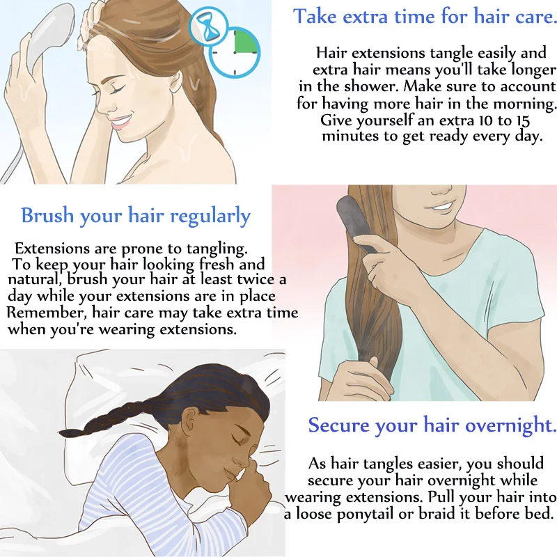 1. Рекомендуется мыть волосы как можно меньше, каждые 4-5 дней. 2. Используйте шампунь без сульфат, так как сульфат может повредить ваши расширение. Избегайте использования слишком много средств для волос, потому что это также может вызвать спутывание и Матирование. Применение кислой шампунь для волосы светлого цвета для наращивания может помочь избежать матирования 3. После очистки волос используйте Кондиционер для волос. Это может очень хорошо продлить срок службы волос 4: пожалуйста, используйте теплую воду вместо слишком горячей воды 5: расчесывайте волосы сверху вниз, распутывая их