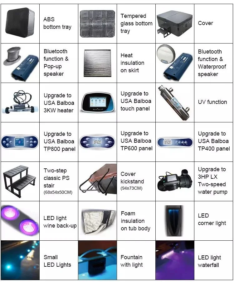 1. Опытные и безопасные гарантии: -Наша фабрика специализируется на производстве гидромассажной ванны с 1995 года, с опытными дизайнерами и инженерами, и более 100 квалифицированных рабочих в нашей команде. -Все ванны изготавливаются строго в соответствии с CE, RoHS, SAA, CSA, GMC, ETL и т. д. 2. Экологически чистый и высокий EER: -Лучшее качество водяных насосов с высоким коэффициентом энергоэффективности. -Одобрение RoHS для всех электронных компонентов. -Корпус ванны изготовлен из американского происхождения, акриловый, здоровый и прочный. 3. Удобное управление: -Все гидромассажные ванны построены-в системе управления США Бальбоа, нагревателе Бальбоа и озоновом стерилизаторе США, легко управлять гидромассажной ванной умным способом, экономьте свое время и деньги. 4. Гарантия и обслуживание: -Каждый продукт прошел тестирование и контроль качества перед отправкой. -Детали гарантии: 5 лет оболочки, 2 года компонентов. -Профессиональная команда предлагает вам лучшие консультации и послепродажное обслуживание.