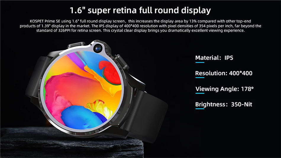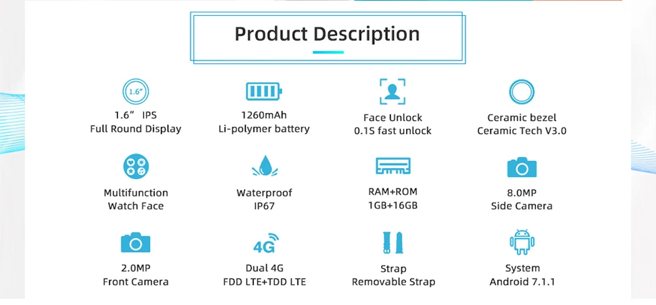 Основная информацияОперационная системаAndroid 7.1.1Система поддержкиВыше iOS 9,0 и Android 5,1Сенсорный режимПолный сенсорный экран (одна точка)ЦПMTK6739 1,25 ГГцRAM1 ГбПЗУ16 ГбИдентификатор лицаПоддержкаКамераСпереди: 2.0MP Сторона: 8.0MP(5 Мп обновление программного обеспечения)Аккумулятор 1260 мАчТип батареи Полимерный аккумуляторВремя в режиме ожиданияРежим ожидания: 3-5 дней Время ежедневного использования: about1-2 днейВодонепроницаемый IP67 водонепроницаемыйДисплей и внешний видРазмер дисплея1,6"Тип экранаTFT IPSРазрешение400*400ПодключениеРемешокTDD LTE: B38(2600 МГц), B39(1900), B40(2300), B41(2500)
