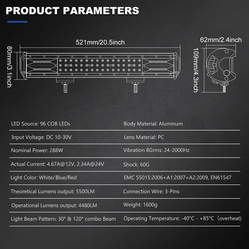 Технические характеристики: Мощность светодиода: 288 Вт Рабочее напряжение: 10-30 В постоянного тока Водонепроницаемость: IP 67 Источник светодиодов: 96 светодиодов COB Цветовая температура: 6000K белый/синий/красный Дополнительный луч: комбинированный луч Материал: литой под давлением алюминиевый корпус Материал линзы: PMMA Крепление: регулируемый кронштейн с болтом M6 Теоретический Световой поток: 5500lm Оперативный Световой поток: 4480lm Фактический ток: 24 В = 2,34 А, 12 В = 4,67 А 30000 часов выше срока службы Если вам нужен белый/янтарный свет, пожалуйста, нажмите на эту ссылку или свяжитесь с нами. В комплект входит: (зависит от вашего выбора) 1 Светодиодная панель (или 1 Светодиодная лампа и 1 провод) Аксессуары для монтажаВ детстве я обожал смотреть мультик по этой вселенной. Каждая битва прям наполняла адреналином и постоянно хотелось почувствовать себя на... Читать отзыв полностью...