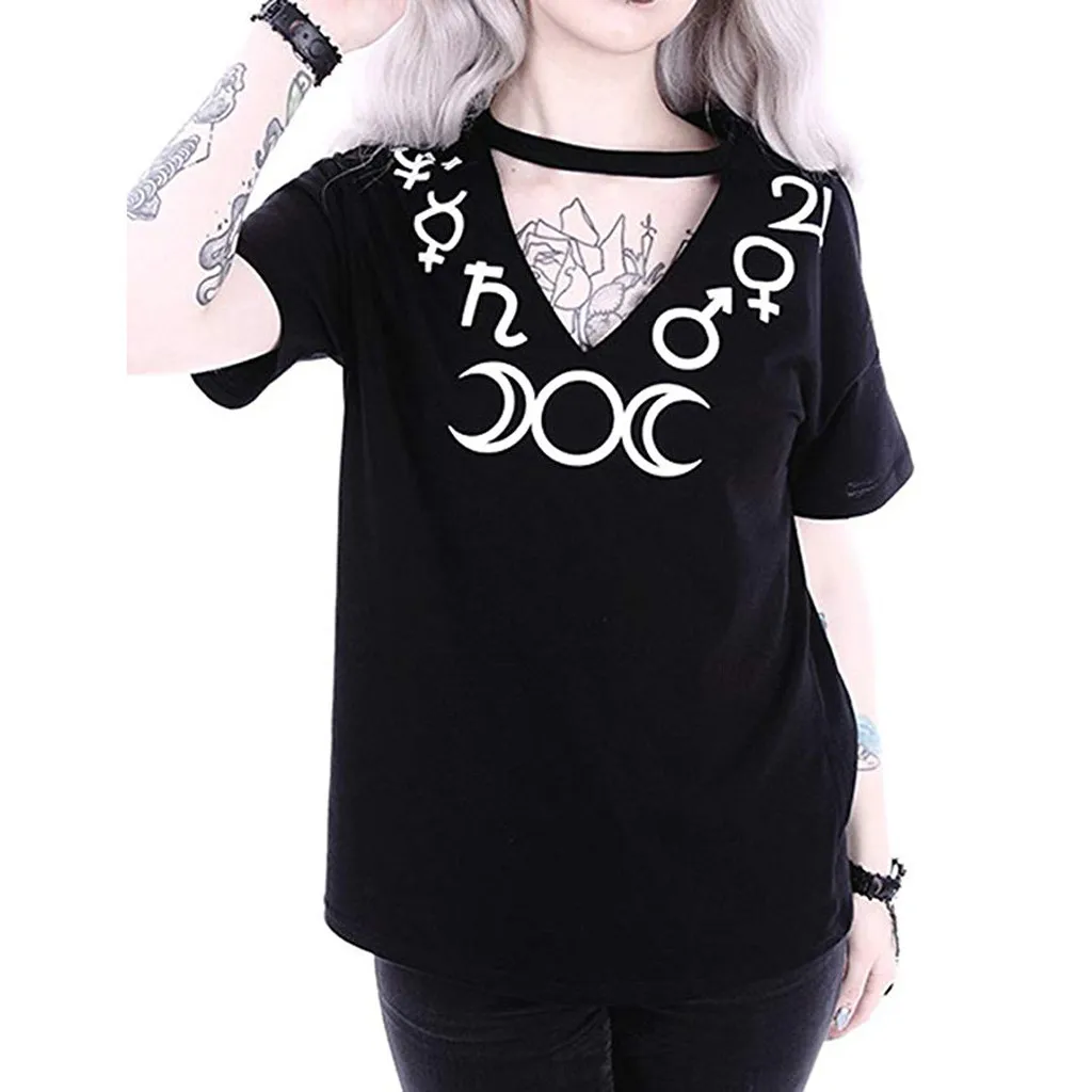 Женский готический панк-топ с принтом Луны, черный сексуальный топ с чокером и v-образным вырезом, футболка с коротким рукавом