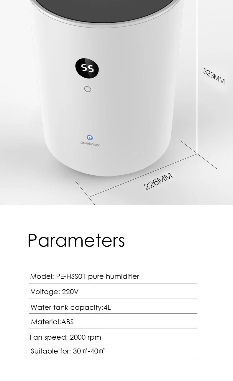 Название: чистый увлажнитель PE-HSS01 напряжение: 220 В-240 В (50 Гц-60 Гц) Емкость: 4000 мл Материал: АБС-пластик Скорость вентилятора: 2000 об/мин Цвет: белый, деревянный Длина провода: 1,2 m подходит для дома, офиса, Спальня, гостиная...
