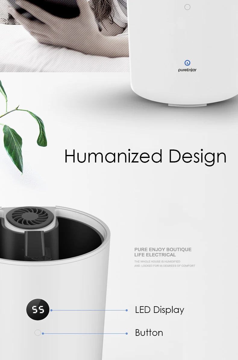 1. Корпус машины разработан с наклонным плечом, более элегантный вид. 2. Двухъядерный источник питания, распылитель шире, подходит для использования в помещении 30-40 м2. 3.4L большая емкость, 280 мл/час рабочая скорость, автоматическая защита от отключения питания. 4. Интеллектуальное измерение влажности, интеллектуальная Постоянная Влажность, контроль влажности в помещении при 55 °. 5. Верхняя часть обеспечивает водную конструкцию, более удобную. 6. Бесшумный дизайн, шум <36 дБ. Не будет беспокоить вашу работу и отдых. 7. Визуализация влажности, светодиодный дисплей влажности в помещении.