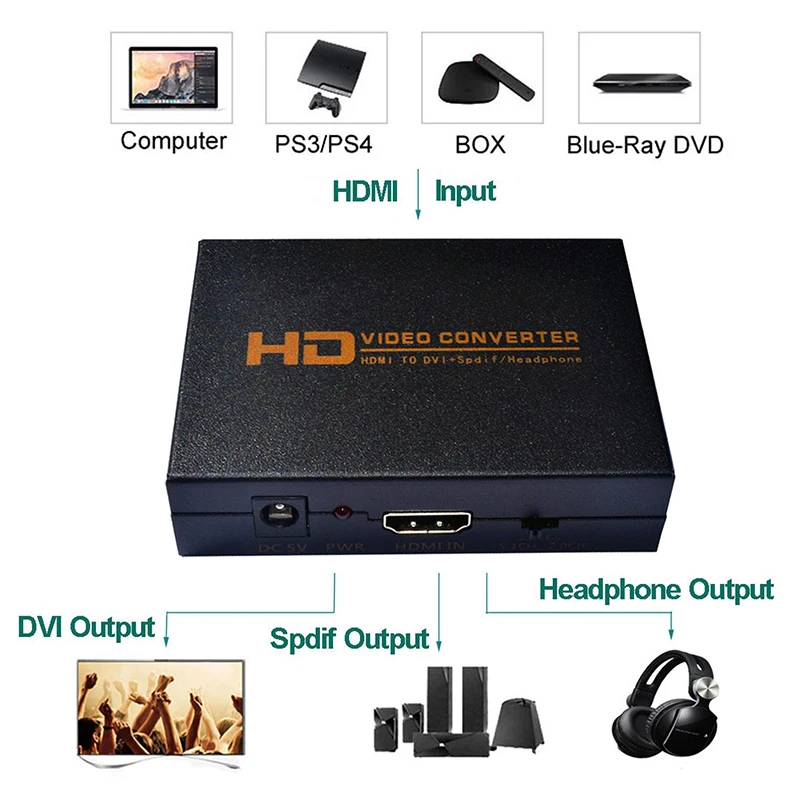 Введение: Конвертер HDMI-DVI может преобразовывать сигнал HDMI в сигнал DVI с аналоговым стерео и коаксиальным цифровым аудиосигналом, это позволяет подключать выход HDMI от PS3, blue ray DVD или другое видео оборудование на вход DVI мониторов. Его высокая пропускная способность поддерживает широкий спектр источников и мониторов. Особенности: Нет необходимости устанавливать драйверы, портативный, гибкий, подключи и работай. Определите HDCP автоматически, чтобы избавиться от ключа hdcp. Совместим с HDMI1.3. Поддержка аналогового стерео и коаксиального цифрового аудиовыхода. Особенности: 1. Входные порты: 1xHDMI. 2. Выходные порты: 1xDVI,1xEarphone,1xSpdif 3. Размеры (мм): 80(D)x84(W)x28(H) 4. Вес (г): 200 5. Разрешение входного выхода: 480p, 720p,1080i,1080p. 640x480 60 Гц, 1280x720 60 Гц, 800x600 60 Гц, 1024x768 60 Гц, 1360x768 60 Гц, 1440x900 60 Гц, 1280x1024 60 Гц, 1680x1050 60 Гц, 1600x1200 60 Гц, 1920x1080 60 Гц, Посылка включает в себя: HDMI в DVI + Аудио конвертер X1 Блок питания 5 в постоянного тока (ЕС или Великобритания или США или Австралия) X1