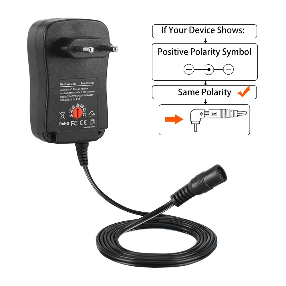 Использование: Для мобильного телефона, ТВ-приставка, CCTV, камера, аудиоплеер, телефон, CD, VCD, ретранслятор, рация, компьютер, электронный орган, игровая машина, маленький телевизор, медицинское оборудование, компьютерное и электронное оборудование и т. Д. Мощность: 30 Вт Выход USB: 5 В = 2.1A Макс. Сертификация CE / RoHS /FCC 100% абсолютно новый 100V-240V AC в DC адаптер питания Входное напряжение: 100-240VAC 0.3A 50/60Hz Выходное напряжение: 3 в 4,5 в 5 в 6 в 7,5 в 9 в 12 В (ручная регулировка) Выходной ток: 2.5A Макс, совместим с 500mA, 1A, 1.5A Теплые советы: во-первых, пожалуйста, переместите переключатель на выходное напряжение, которое вам нужно, а затем подключите питание!
