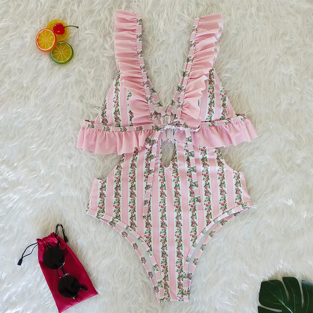 Женский купальник-бикини 2020 с цветочным принтом и оборками, комплект из двух предметов, бандажный купальник, милый купальник для девочек, пляжная одежда