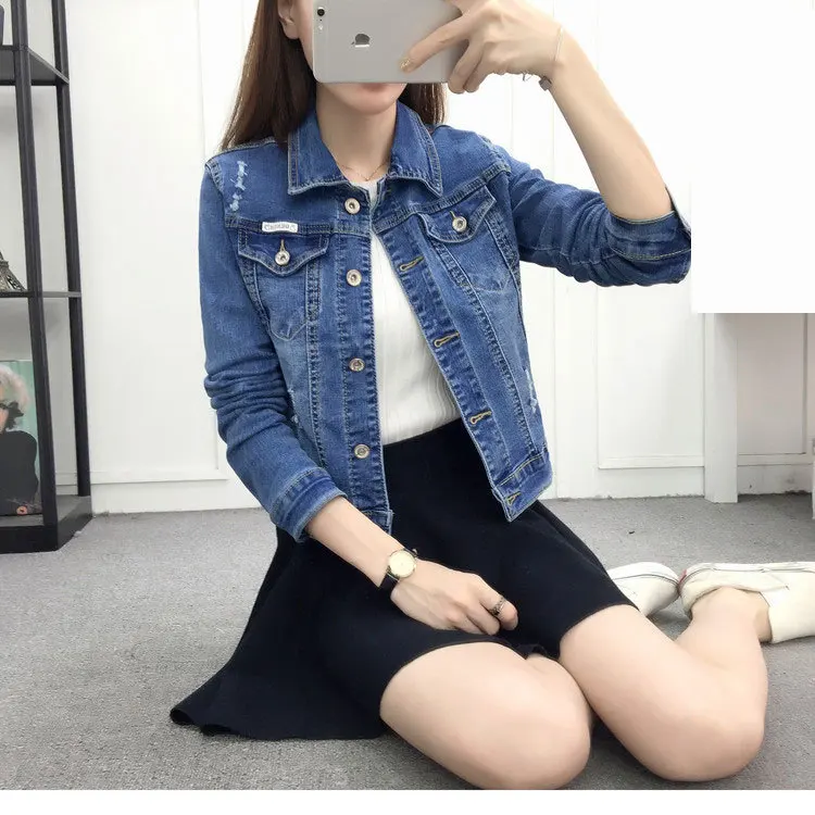 Женская джинсовая куртка с длинным рукавом, приталенное синее пальто с отворотом, повседневная короткая куртка в Корейском стиле для студентов, Модель W7 на весну, 2019