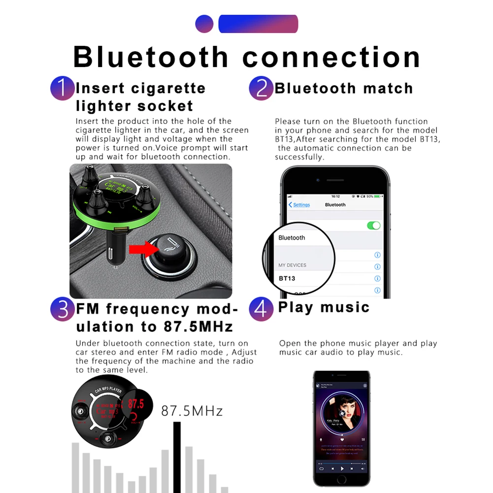 Автомобильный fm-передатчик MP3 Беспроводной bluetooth-плеер телефонные звонки в режиме Hands-free USB быстрозарядный аккумулятор Напряжение обнаружения цифровой Дисплей USD 18,97Долларов США/шт Особенности:1. версия Bluetooth 4,0, поддержка Bluetooth вызовов, передача музыки Bluetooth, звонящий с голосовым сопровождением.2. Поддержка TF карты/U воспроизведения диска и функции чтения карт, поддержка MP3/WMA формата музыки.3. Двойной USB зарядка, один порт 2.1A, и другой одиночный порт 1A (и чтение музыки) используется для зарядки внешних портативных устройств, подходит для всех мобильных телефонов, планшетов и других электронных продуктов.4. 1,3 дюймовый ЖК-матричный дисплей, напряжение загрузки, частота FM, имя музыкального файла и статус работы.5. Кнопка knob ручки поддерживает выбор и подтверждение режима CH +-/menu и menu.6. Кнопка knob поддерживает Преобразование режима громкости +-, Bluetooth.7. Кнопка knob поддерживает переключатель, музыку вверх и вниз/Музыка пауза/ответ/отклонение.8. input функция входа AUX.9. output функция выхода AUX.10. Поддержка отключения памяти и воспроизведения папок.11. Поддержка одного нажатия меню настройки языка, режим воспроизведения, звуковой режим (мульти-язык включает: китайский, английский, французский, немецкий, итальянский, португальский, русский, испанский)12. Частота fm-передачи составляет 87,5-108,0 МГц.Описание:Название продукта: BT13 Автомобильный MP3-плеерЦвет изделия: красный, синий, зеленыйМатериал изделия: металл + АБСВерсия Bluetooth: 4,0 + EDRТехнология обработки звука Bluetooth: A2DPBluetooth микрофон Эффективное расстояние: 0,5-2 мРасстояние передачи Bluetooth: 10 мДисплей: 1,3 дюймовый ЖК-матричный экранTF и U диск: TF/64 ГБ и U диск/128 ГБФормат музыки: MP3/WMAЧастота передачи FM: 87,5-108,0 МГцРабочее напряжение: 12-24 ВИскажения: <0,1Отношение сигнал-шум:> 60dbДвойной AUX: № 1 AUX Вход & № 2 AUX ВыходЗарядка через USB: 5 В/2,1 + 1AВес нетто продукта около 85 гРазмер изделия: около 12*8 см/4,72*3,15 дюймаУпаковочный лист:1 * хост1 * Инструкция по эксплуатации 1 * AUX кабель