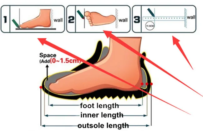 1. Для полных ступней: внутренняя длина = 1 см + длина ступни; 2. Для тонких ног: Внутренняя Длина = 0,5 см + стопы Длина; 3. Если вы получили ни жира, ни при узкой стопе: Внутренняя Длина = 0,8 см + стопы Длина Размеры указаны в см, пожалуйста, примите во внимание, что 1 см = 0,39 дюйма, 1 дюйм = 2,54 см. Измерьте длину ноги вашего ребенка, когда он или она стоят на полу (Держите ногу плоской на полу); Когда кто-то стоит стоя, длина ступни будет немного больше, чем у кого-то, кто ломается. (Размер обуви-это просто ссылка для размещения заказов.) Замеры производились вручную, замеры сделаны вручную, поэтому возможны случайная погрешность: плюс или минус 0,3 см.