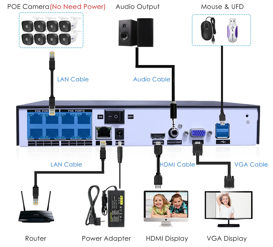 Этот NVR IP камера системы добавить модуль порта вызова, с переключением между дальним и Ethernet-кабель предоставляет видео и мощность. Камеры PoE не нуждаются в дополнительной электропроводке, избегайте электрической утечки, простой проводки. PoE NVR равен обычному NVR и PoE switch.