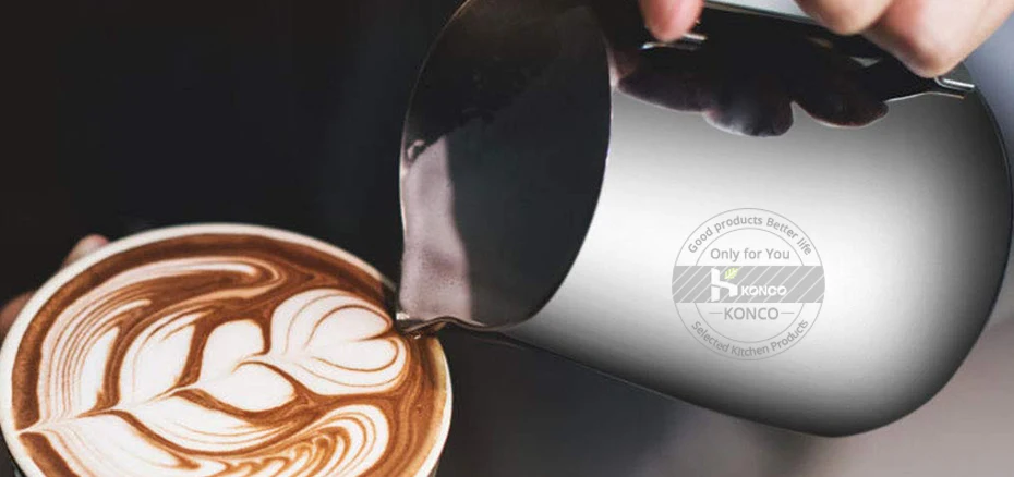 【Профессиональное Качество 】Кувшин KONCO frothing изготовлен из пищевой нержавеющей стали 18/8 с антипригарным тефлоновым покрытием, коррозионно-стойким, пятнистым, ударостойким и термостойким, прочный и долговечный для долгосрочного использования. Легко чистить и мыть в посудомоечной машине.