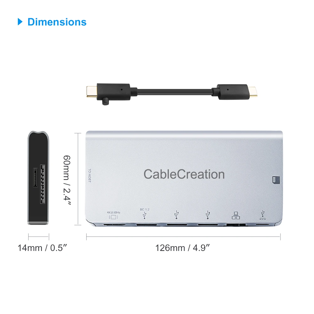 -Сторона 1 (вход): USB 3,1 Type C Male -Сторона 2 (выход): * HDMI x1, поддерживает разрешение до 4K x 2K @ 30Hz * VGA x1, поддерживает разрешение до 1920x1200 @ 60 Гц * USB 3,0 x2 * RJ45 x1, поддерживает 10 / 100 / 1000 Мбит/с * Слот для sd-карты x1 * Слот карты Micro SD x1 * USB-C женский x 1, поддерживает данные (5 Гбит/с) или зарядку питания 100 Вт (20 в/5A) Цвет: серый Кабель Длина: 4,7 дюйм (ов)