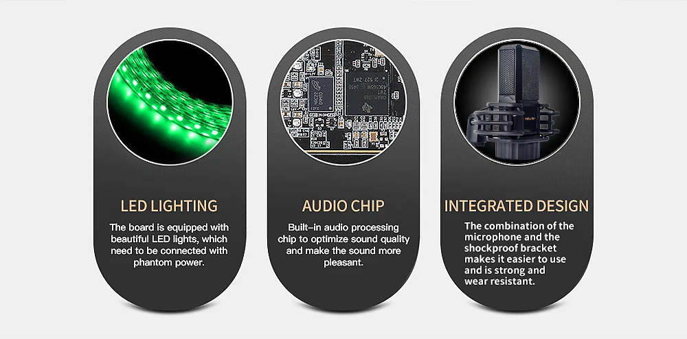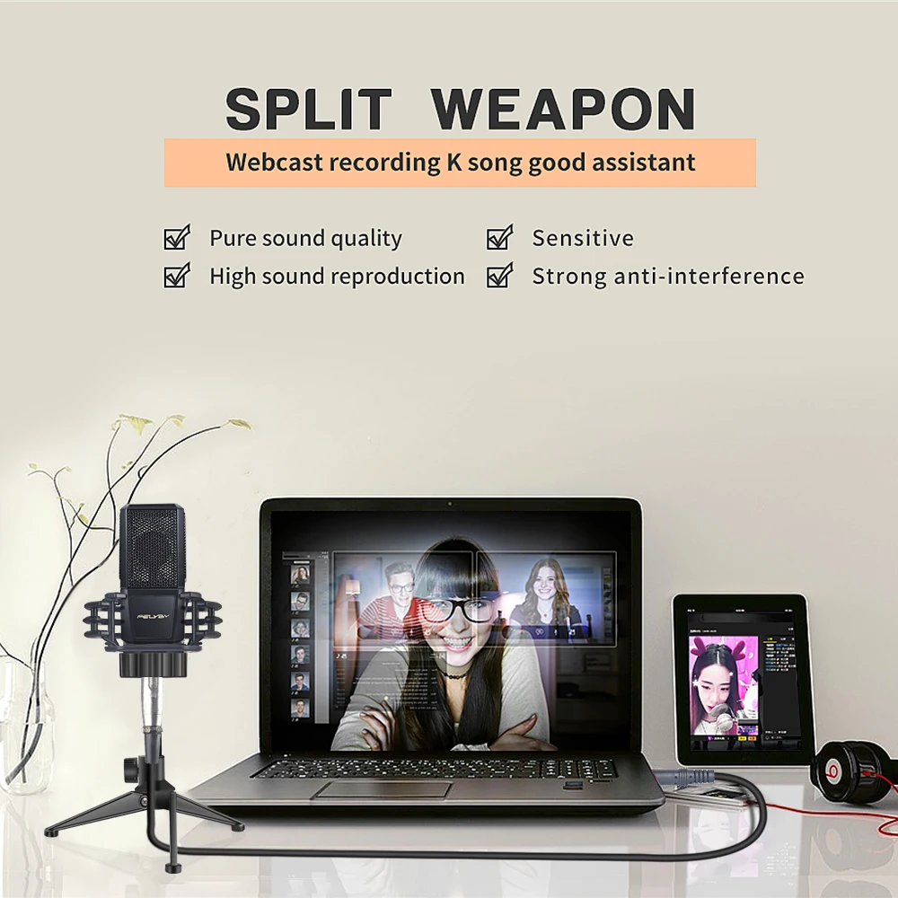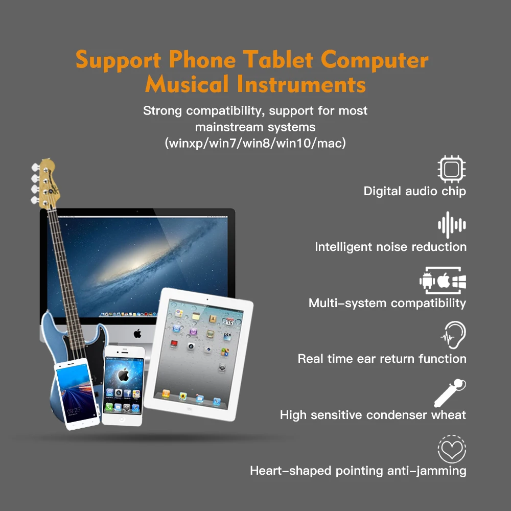 1. Изысканный внешний вид 2. Отличный эффект захвата 3. Четкое качество звука 4. Высокая чувствительность 5. Конденсаторный микрофон 6. Точка в форме сердца 7. Меньше шума 8. Сильная защита от помех