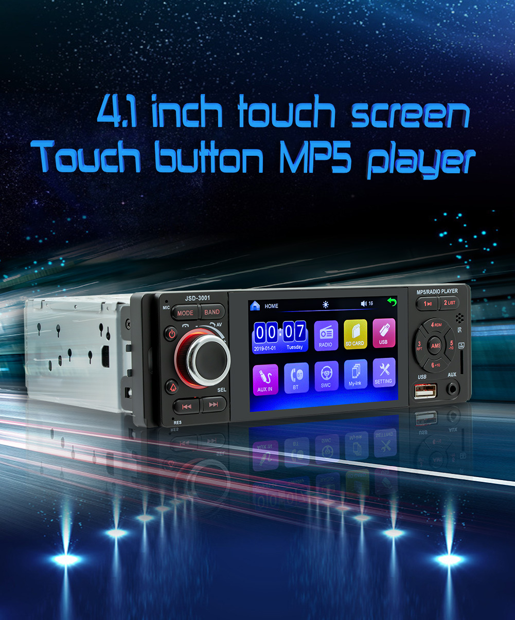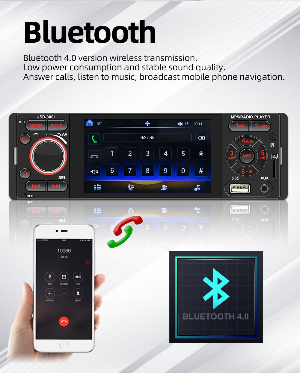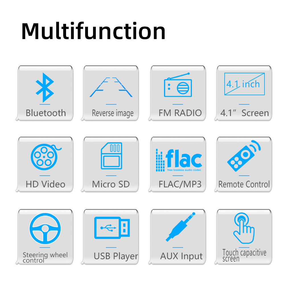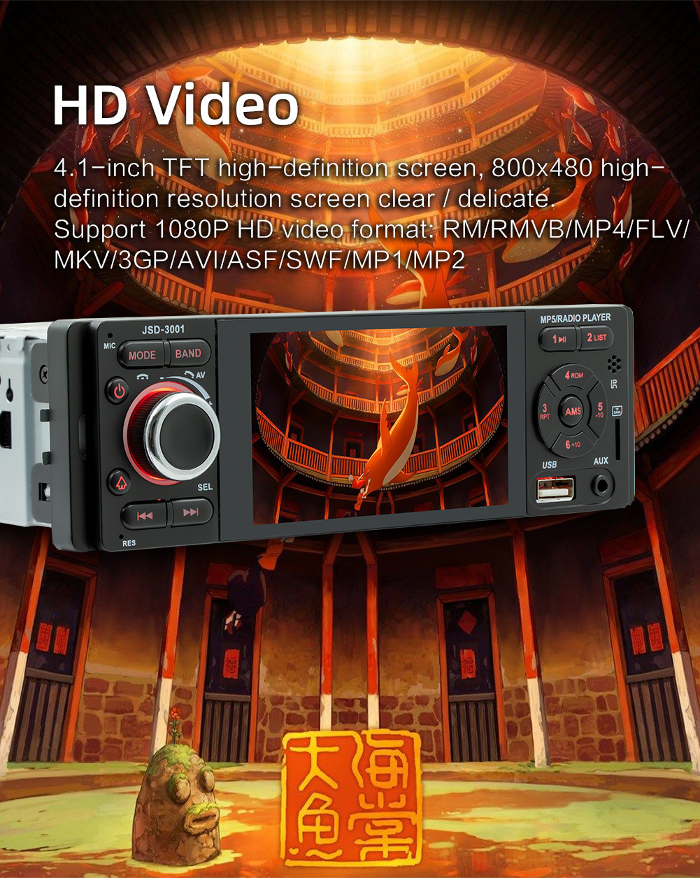 1. 4,1 "" высокой четкости цифровой экран 800*4802. 7 цветов кнопочный задний светильник3. Поддержка формата воспроизведения аудио MP3/WMA/WAV/FLAC/APP и т. Д.4. Поддержка формата воспроизведения видео RMVB/RM/VOB/DIVX/AVI /ASF/3GP и т. Д.5. С передним портом USB2.0 и слотом для карт TF6. Функция BT, бесплатный звонок и BT Музыка7. Усилитель на полевых МОП-транзисторах: 50 Вт x 4 Максимальная выходная мощность8. Fm-радио9. Полный ИК-пульт дистанционного управления10. Отключение питания с функцией автоматического хранения памяти в режиме радио или TF/USB11. Функция часов12. Функция отключения звука13. Басы и высокие частоты, L & R стабилизатор канала14. Функция переднего AUX15. Функция двустороннего видеовыхода16. Две функции аудиовыхода RCA17. Функция одностороннего ввода видео18. Функция ввода камеры заднего вида (по желанию)19. Функция управления рулевым колесом (на выбор)Посылка включает: