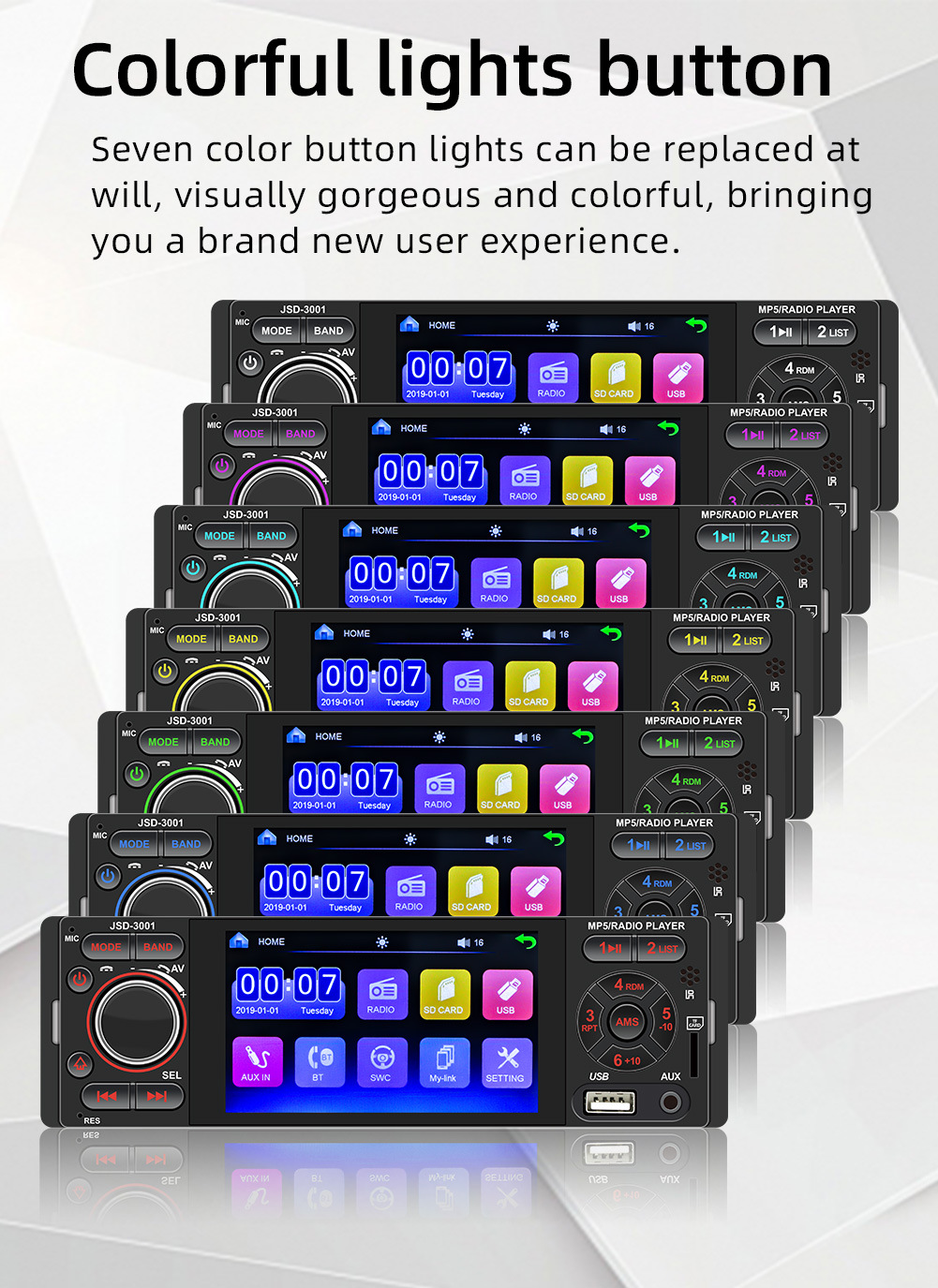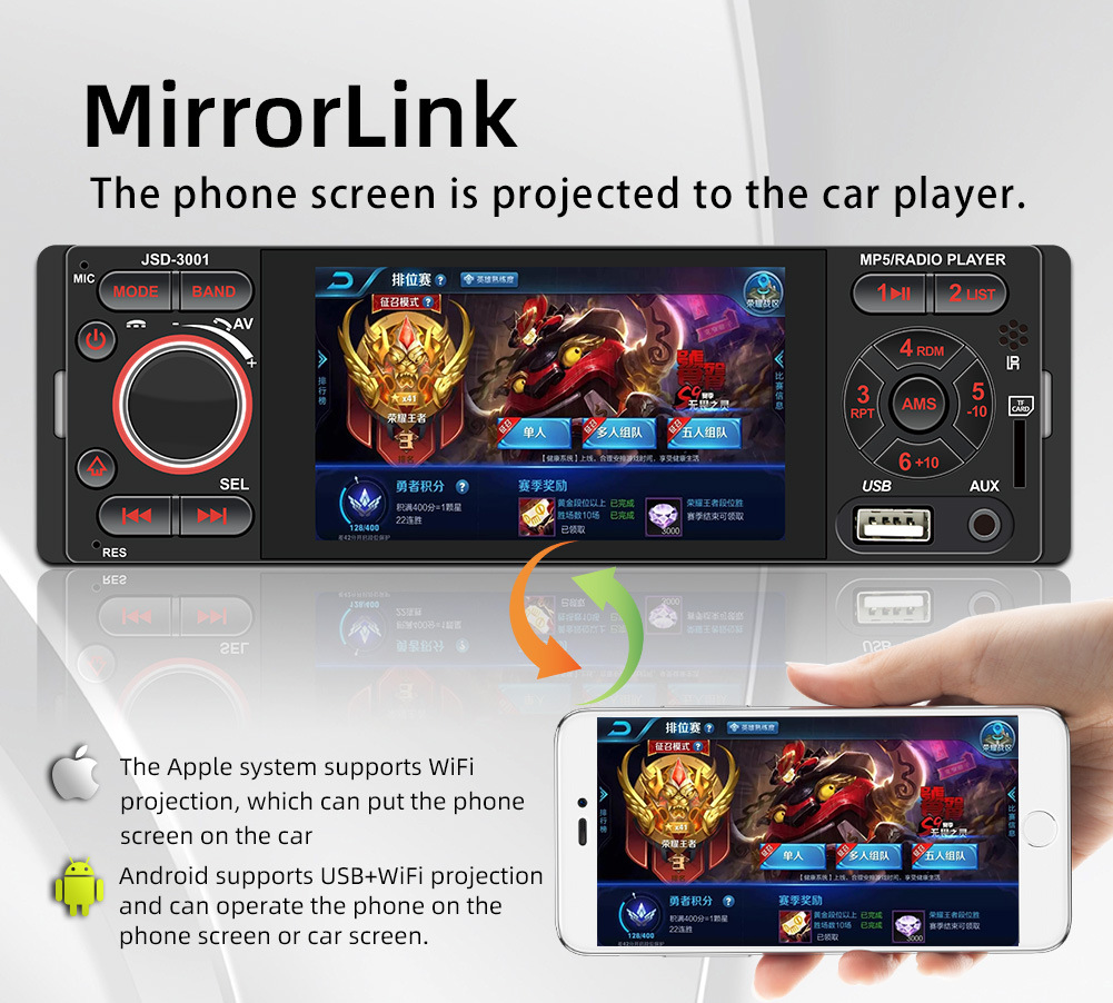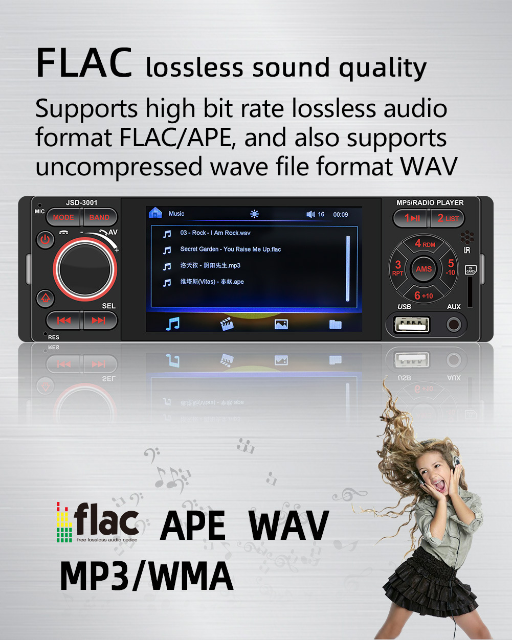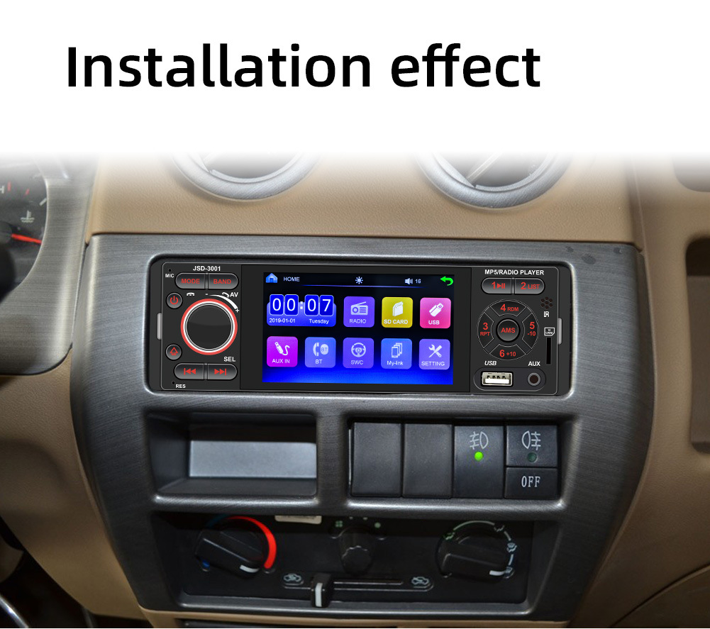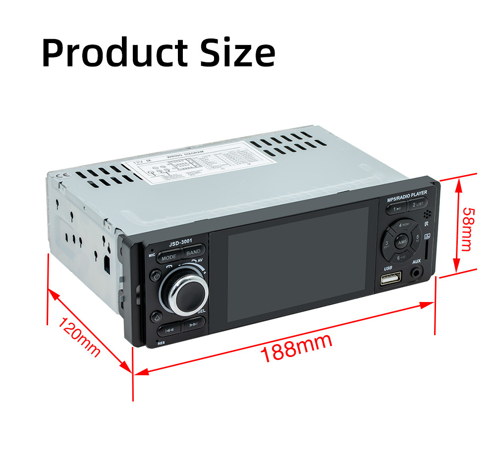 1. 4,1 "" высокой четкости цифровой экран 800*4802. 7 цветов кнопочный задний светильник3. Поддержка формата воспроизведения аудио MP3/WMA/WAV/FLAC/APP и т. Д.4. Поддержка формата воспроизведения видео RMVB/RM/VOB/DIVX/AVI /ASF/3GP и т. Д.5. С передним портом USB2.0 и слотом для карт TF6. Функция BT, бесплатный звонок и BT Музыка7. Усилитель на полевых МОП-транзисторах: 50 Вт x 4 Максимальная выходная мощность8. Fm-радио9. Полный ИК-пульт дистанционного управления10. Отключение питания с функцией автоматического хранения памяти в режиме радио или TF/USB11. Функция часов12. Функция отключения звука13. Басы и высокие частоты, L & R стабилизатор канала14. Функция переднего AUX15. Функция двустороннего видеовыхода16. Две функции аудиовыхода RCA17. Функция одностороннего ввода видео18. Функция ввода камеры заднего вида (по желанию)19. Функция управления рулевым колесом (на выбор)Посылка включает: