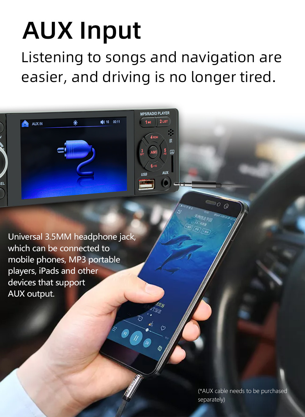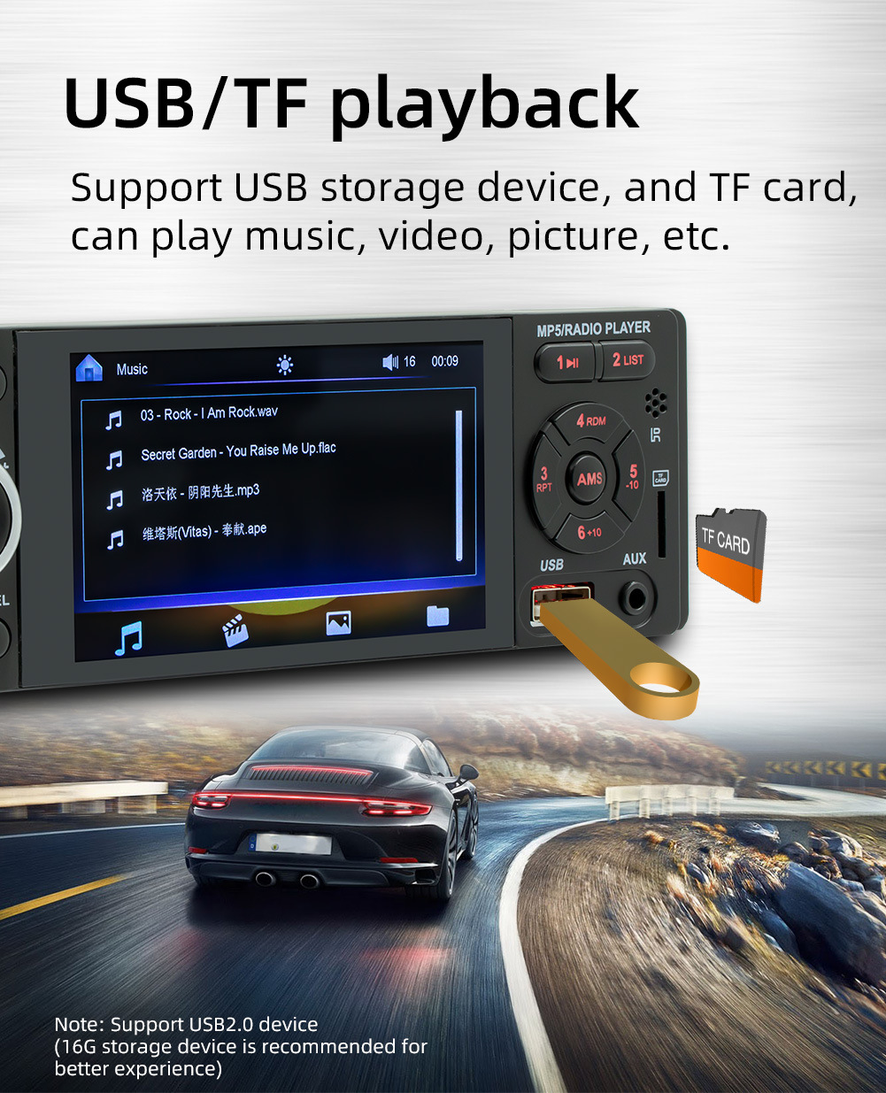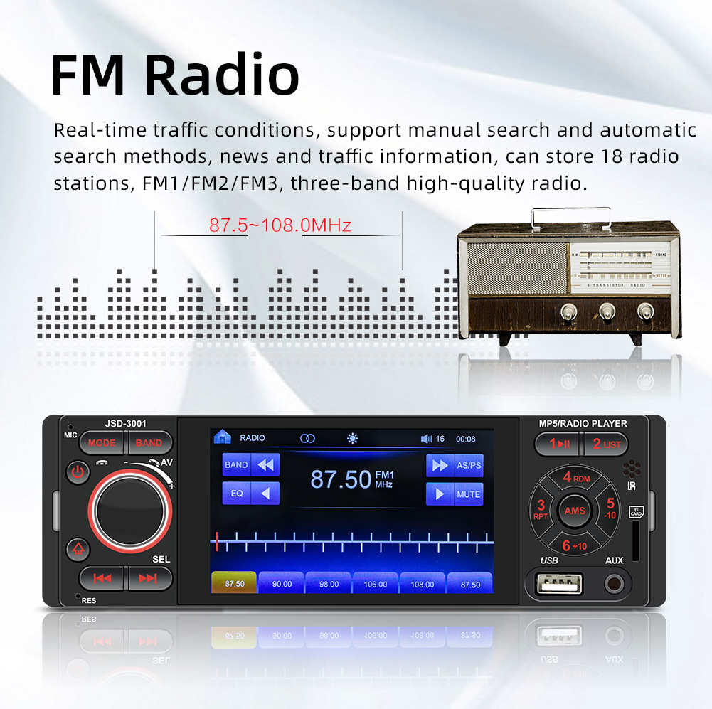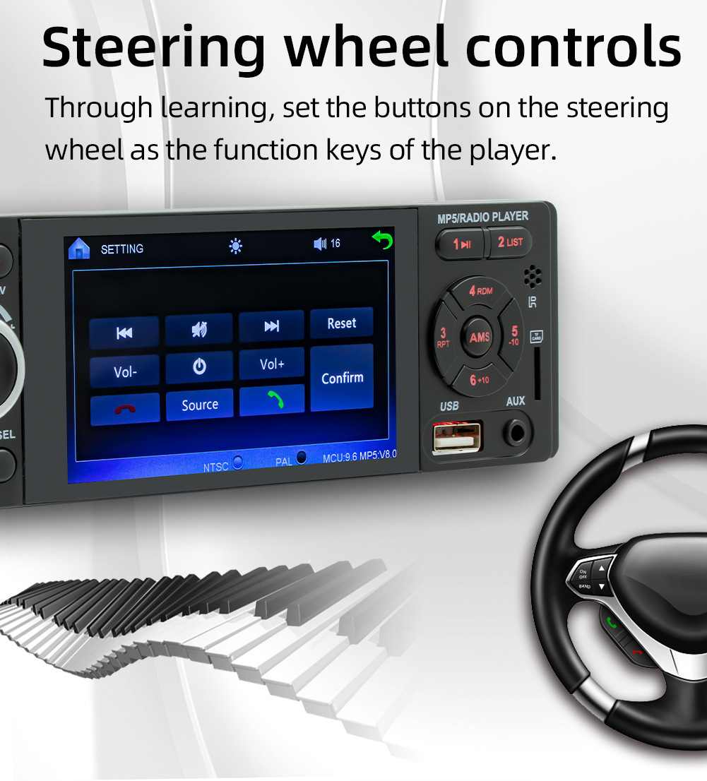 1. 4,1 "" высокой четкости цифровой экран 800*4802. 7 цветов кнопочный задний светильник3. Поддержка формата воспроизведения аудио MP3/WMA/WAV/FLAC/APP и т. Д.4. Поддержка формата воспроизведения видео RMVB/RM/VOB/DIVX/AVI /ASF/3GP и т. Д.5. С передним портом USB2.0 и слотом для карт TF6. Функция BT, бесплатный звонок и BT Музыка7. Усилитель на полевых МОП-транзисторах: 50 Вт x 4 Максимальная выходная мощность8. Fm-радио9. Полный ИК-пульт дистанционного управления10. Отключение питания с функцией автоматического хранения памяти в режиме радио или TF/USB11. Функция часов12. Функция отключения звука13. Басы и высокие частоты, L & R стабилизатор канала14. Функция переднего AUX15. Функция двустороннего видеовыхода16. Две функции аудиовыхода RCA17. Функция одностороннего ввода видео18. Функция ввода камеры заднего вида (по желанию)19. Функция управления рулевым колесом (на выбор)Посылка включает: