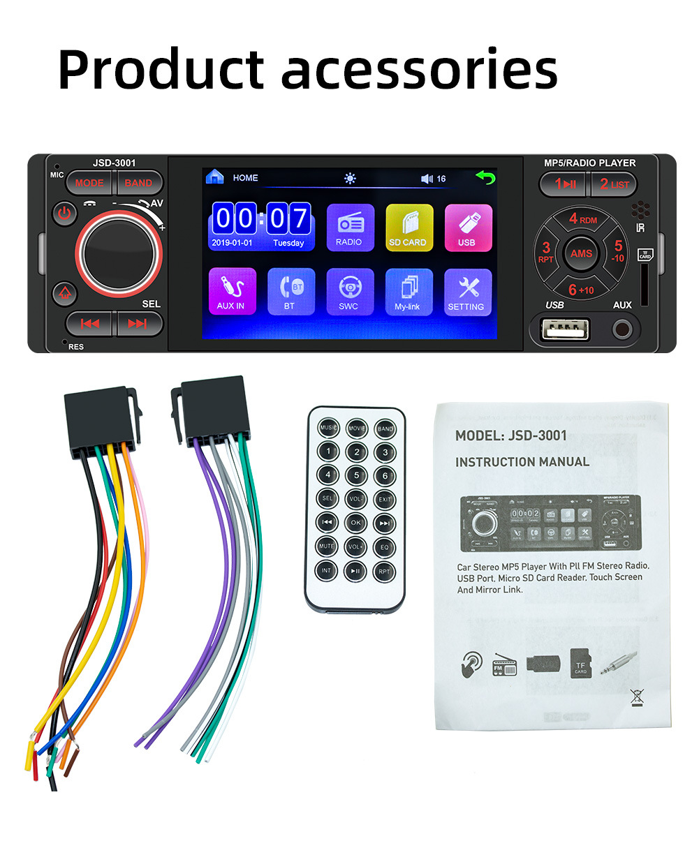 Сенсорный экран автомобиля MP5 плеер * 1Кабель питания * 1Руководство по эксплуатации * 1Пульт дистанционного управления * 1Ключ * 2