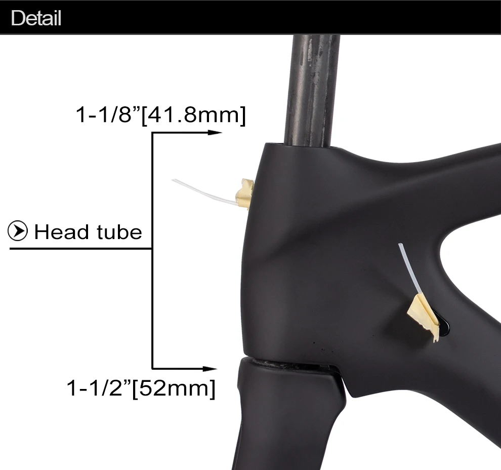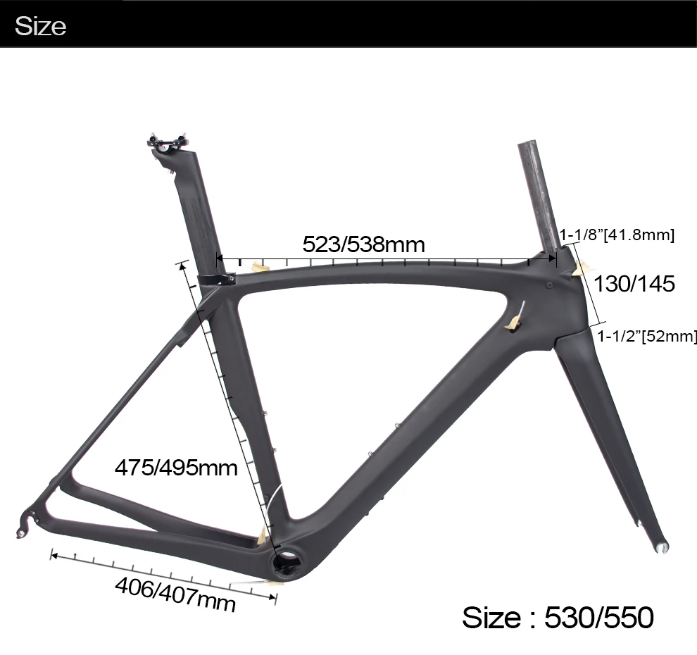 Комплект Рам: рама, вилка, гарнитура, зажим сиденья Материал: углеродное волокно Toray T800 UD Подходящий Нижний Кронштейн: BB386 Гарнитура Размеры: 1-1/8, но не более чем на 1-1/2 зауженного интегрированного Цвет: черный, без логотипа Доступные размеры: 530/550 мм